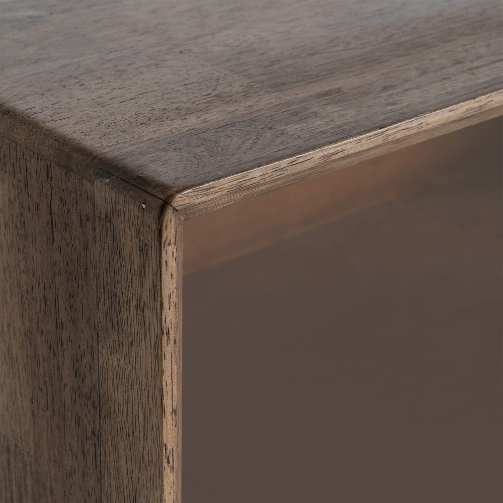 Structura este realizată din lemn de cauciuc cu finisaj maro, care evidențiază textura naturală a materialului și oferă piesei un caracter cald și autentic. Bufetul este compartimentat cu rafturi interioare generoase, vizibile prin ușile din sticlă securizată, permițând atât depozitarea, cât și expunerea obiectelor.