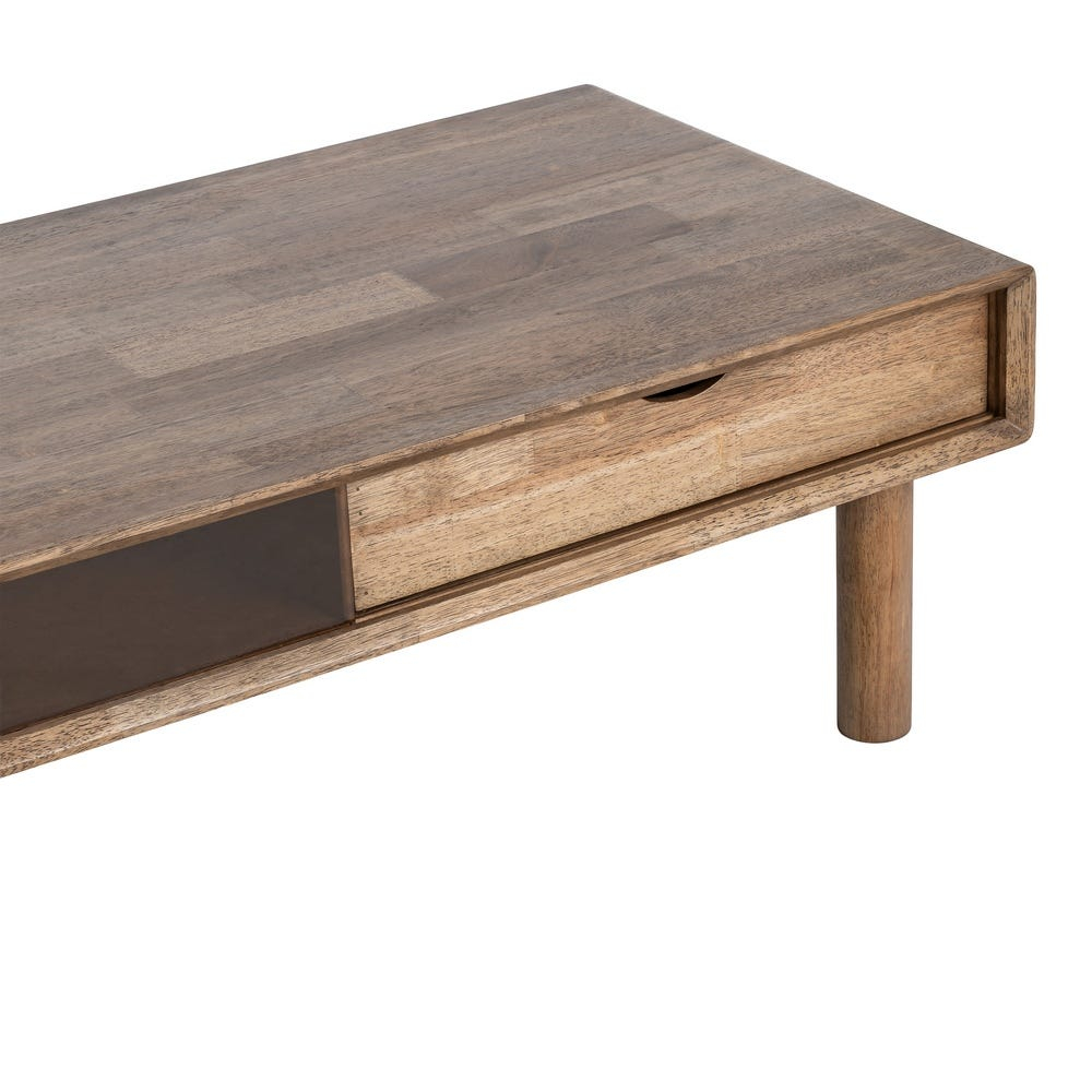 Structura este realizată din lemn de cauciuc, cu finisaj maro care evidențiază textura naturală a materialului. Măsuța include un sertar integrat și un compartiment lateral închis cu panou din sticlă, oferind spații de depozitare discrete pentru obiectele de zi cu zi.
