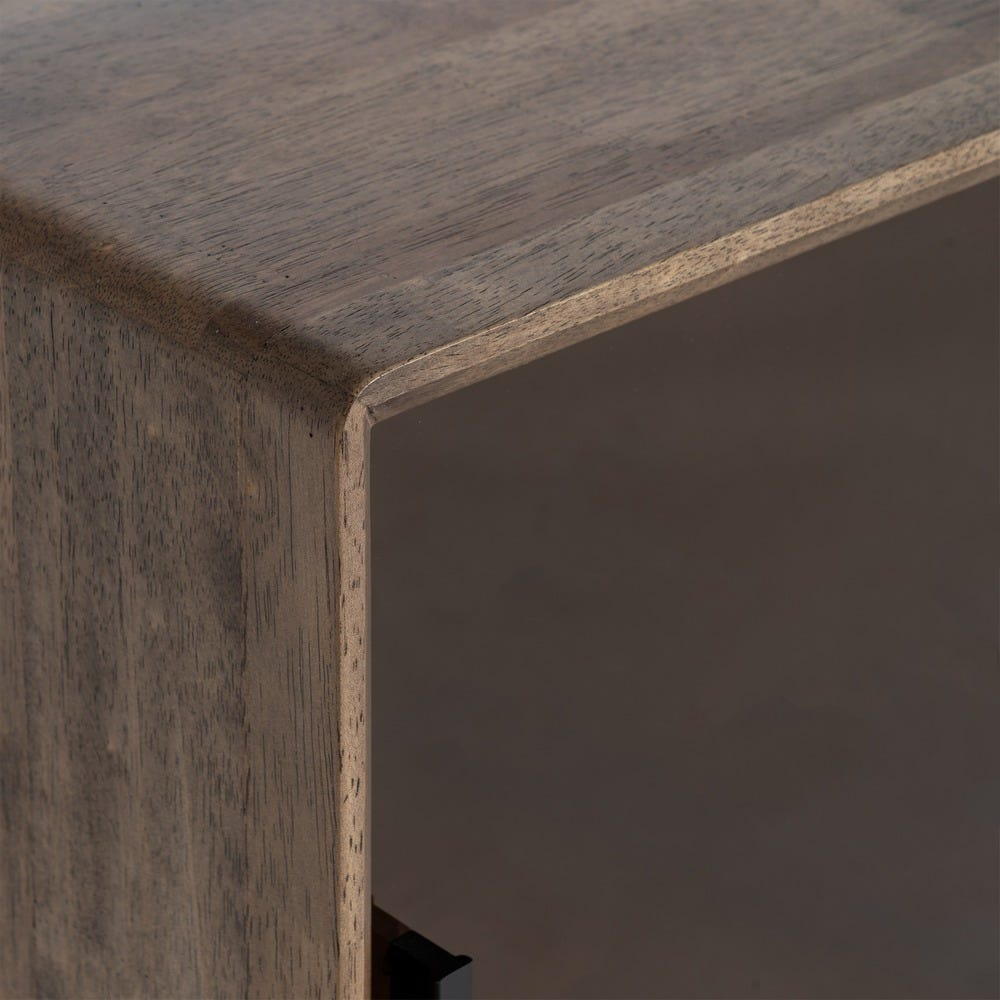 Picioarele cilindrice ridică ușor corpul mobilierului de la sol, oferind un aspect aerisit și o proporție echilibrată. Designul simplu și organizarea clară a spațiilor de depozitare fac din această piesă un element versatil, ușor de integrat în amenajări contemporane sau cu accente naturale.