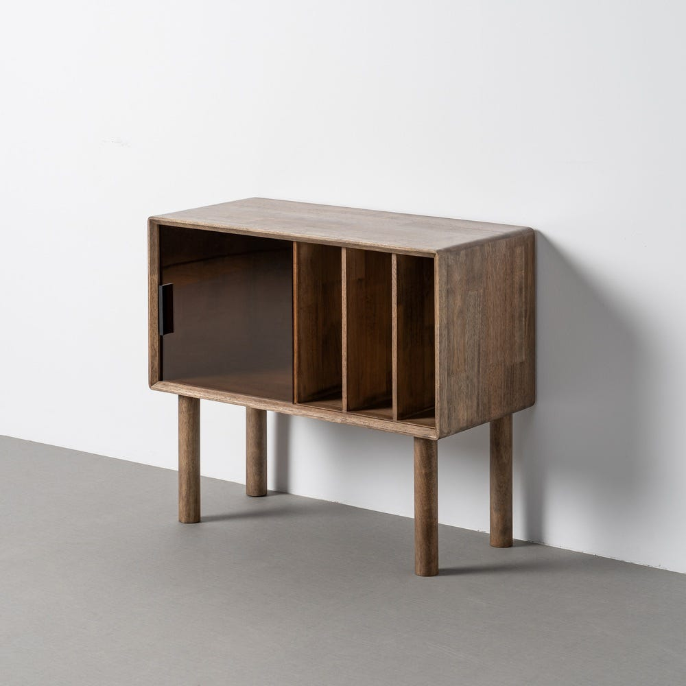 Structura este realizată din lemn de cauciuc, cu finisaj maro care evidențiază textura naturală a materialului. Interiorul este compartimentat prin spații verticale deschise, completate de un compartiment închis cu ușă prevăzută cu inserție din sticlă securizată, adăugând un contrast subtil între opac și transparent.