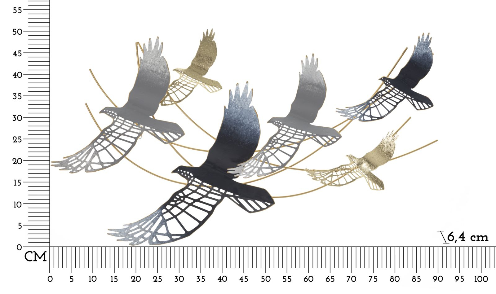 Această decorațiune de perete încântătoare, măsurând 90 cm în lățime și 50 cm în înălțime, prezintă un grup de păsări stilizate în zbor, realizate din metal. Designul combină elemente metalice în nuanțe de gri și auriu, cu detalii rafinate ce reflectă un stil glam distinct. Păsările sunt dispuse într-o compoziție dinamică, conferind o senzație de mișcare și libertate care poate anima orice spațiu. Fiecare pasăre este detaliată cu un model geometric deschis care adaugă un efect vizual aerisit și modern. Această piesă este perfectă pentru a aduce un accent de eleganță și rafinament în decoruri contemporane, fiind ideală pentru livinguri, birouri sau holuri. Aducând un strop de natură reinterpretată printr-o perspectivă artistică, această decorațiune este o alegere superbă pentru cei care doresc să îmbine arta cu elemente de design interior modern.