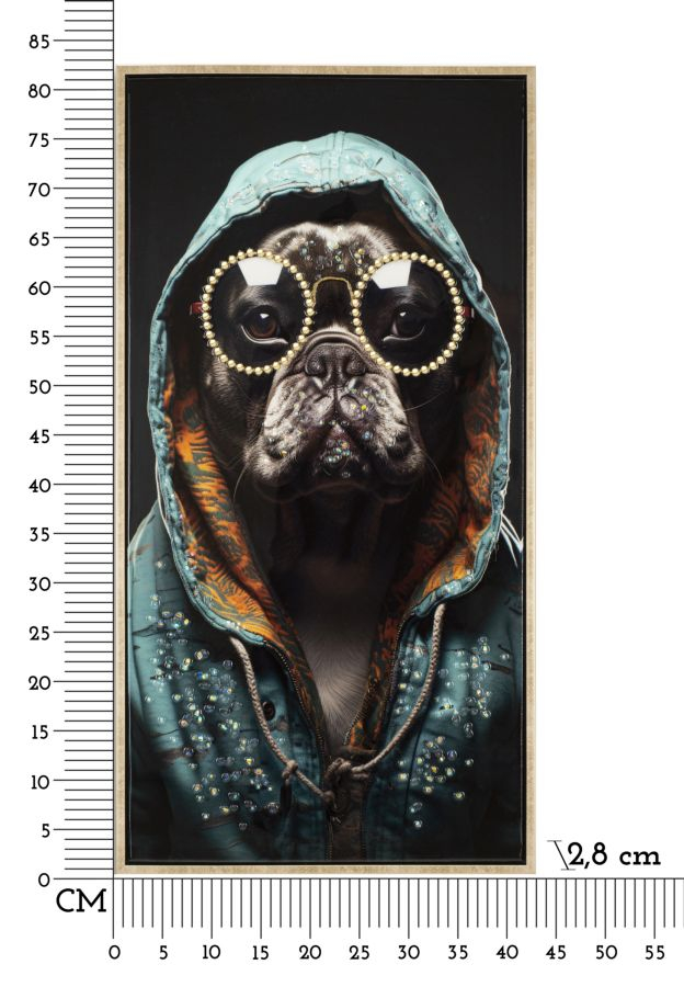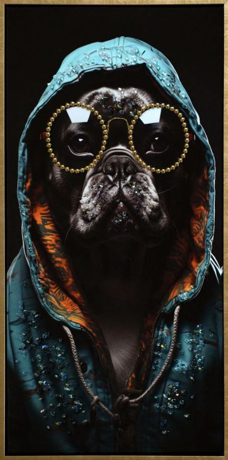 Acest tablou pe pânză, cu dimensiunile de 42 cm lățime și 82 cm înălțime, prezintă un portret captivant al unui pug, îmbrăcat într-o glugă de culoare turcoaz, decorată cu un interior portocaliu și accesorizat cu ochelari cu rame încrustate cu cristale. Acest portret combină elemente realiste și stilizate, evidențiind detaliile expresive și texturate ale feței câinelui. Expresia câinelui, atentă și plină de caracter, este accentuată de accesoriile detaliate și culorile vibrante. Această operă de artă aduce un element de umor și originalitate în orice încăpere, fiind ideală pentru un spațiu familial, o cameră de joacă sau orice altă zonă unde un astfel de portret ar putea adăuga personalitate și culoare. Este, de asemenea, o piesă de conversație remarcabilă, perfectă pentru iubitorii de animale și de artă neconvențională.