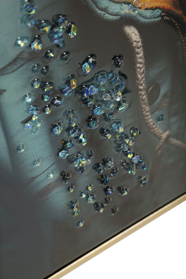 Infrumuseteaza-ti spatiul cu un portret captivant al unui pug in gluga turcoaz si ochelari cu cristale. Ideal pentru a adauga umor si originalitate decorului.