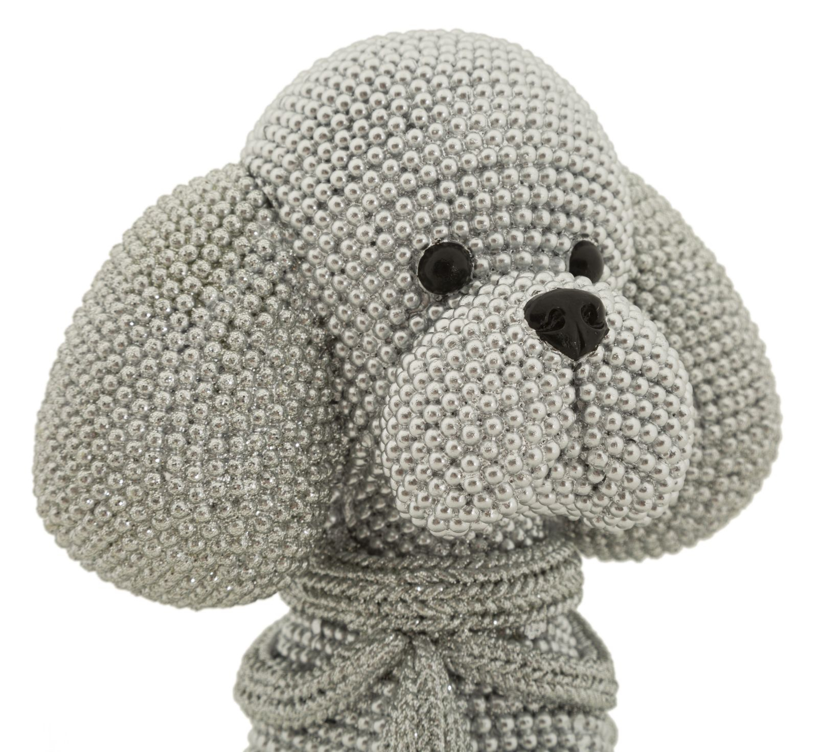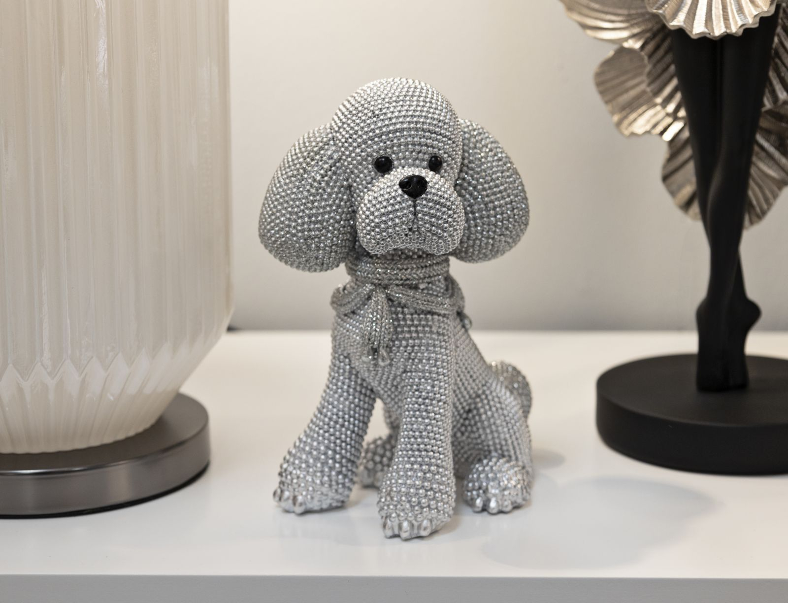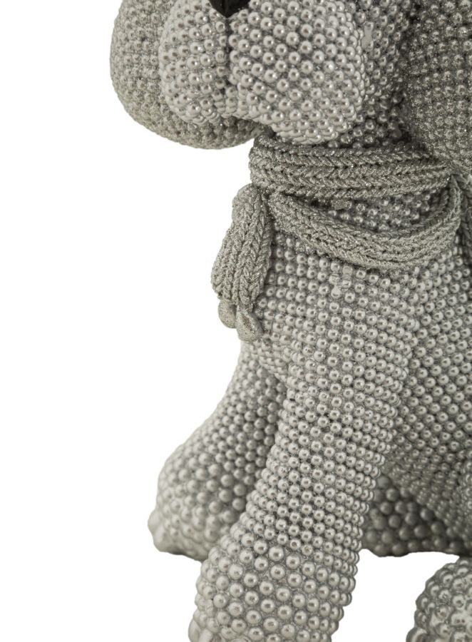 Statuetă cățel din rășină gri cu textură perlată aduce o notă jucăușă și sofisticată în decor. Setul de 2 piese cu eșarfă decorativă captează lumina și atenția.