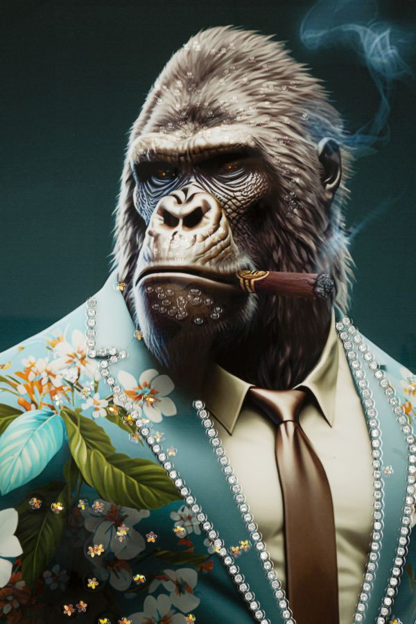 Acest tablou pe pânză, cu dimensiunile de 62 cm lățime și 92 cm înălțime, oferă o reprezentare unică și intrigantă a unui gorilă îmbrăcat într-un costum elegant floral. Portretul prezintă gorila purtând un costum în nuanțe de albastru viu, decorat cu flori albe și portocalii, care contrastează puternic cu tonul serios al expresiei sale. Detaliile sunt minuțios executate, de la textura părului gorilei până la fumul subtil ce se ridică din trabuc și colierele de perle ce adaugă un nivel suplimentar de sofisticare. Combinând elemente de realism în reprezentarea facială cu stilizare în vestimentație și accesorii, acest tablou creează un dialog vizual între lumea animalelor și cultura umană. Această piesă de artă atrage atenția în orice spațiu, oferind o notă de excentricitate și rafinament. Ideal pentru un decor modern sau pentru un spațiu care îmbină elemente clasice cu accente neconvenționale, acest tablou va deveni, cu siguranță, un punct focal în orice încăpere.