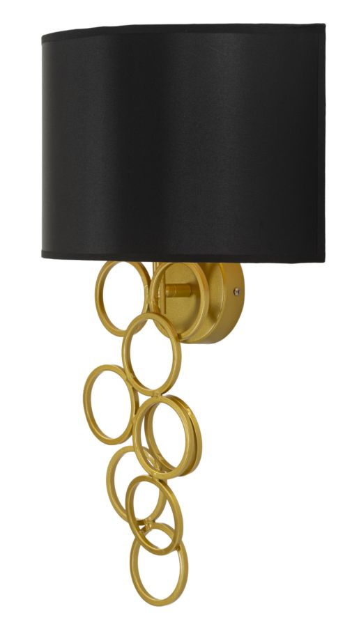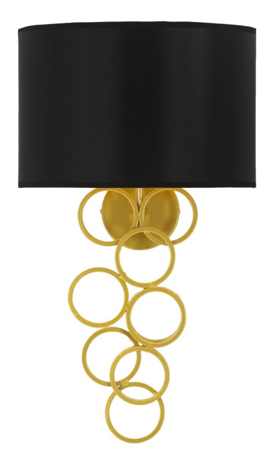 Aplica de perete Rich este o piesă decorativă modernă și elegantă, ce adaugă rafinament și lumină ambientală oricărui interior. Designul său sofisticat, cu abajur negru și structură aurie din cercuri suprapuse, o transformă într-un element statement pentru living, dining sau dormitor.