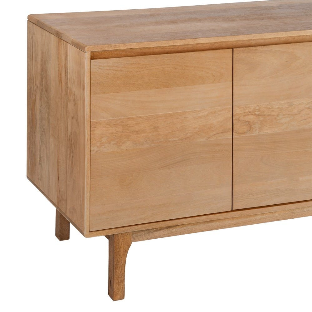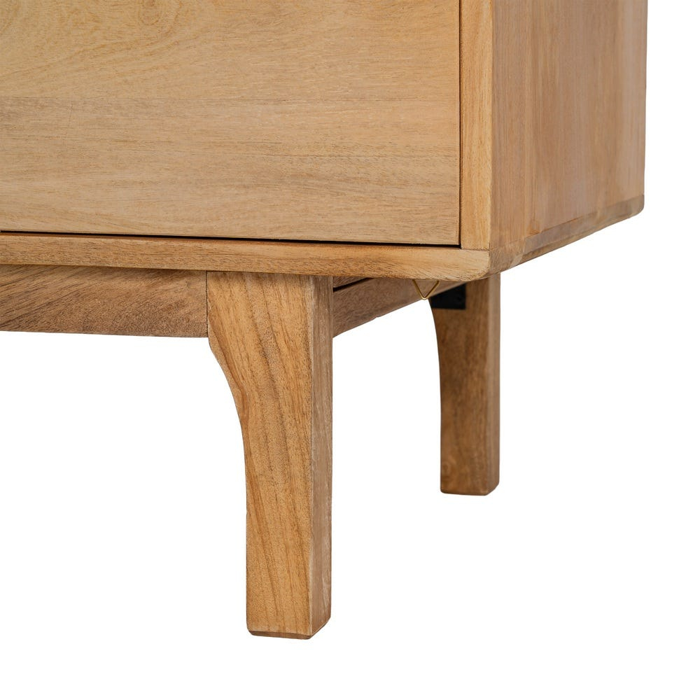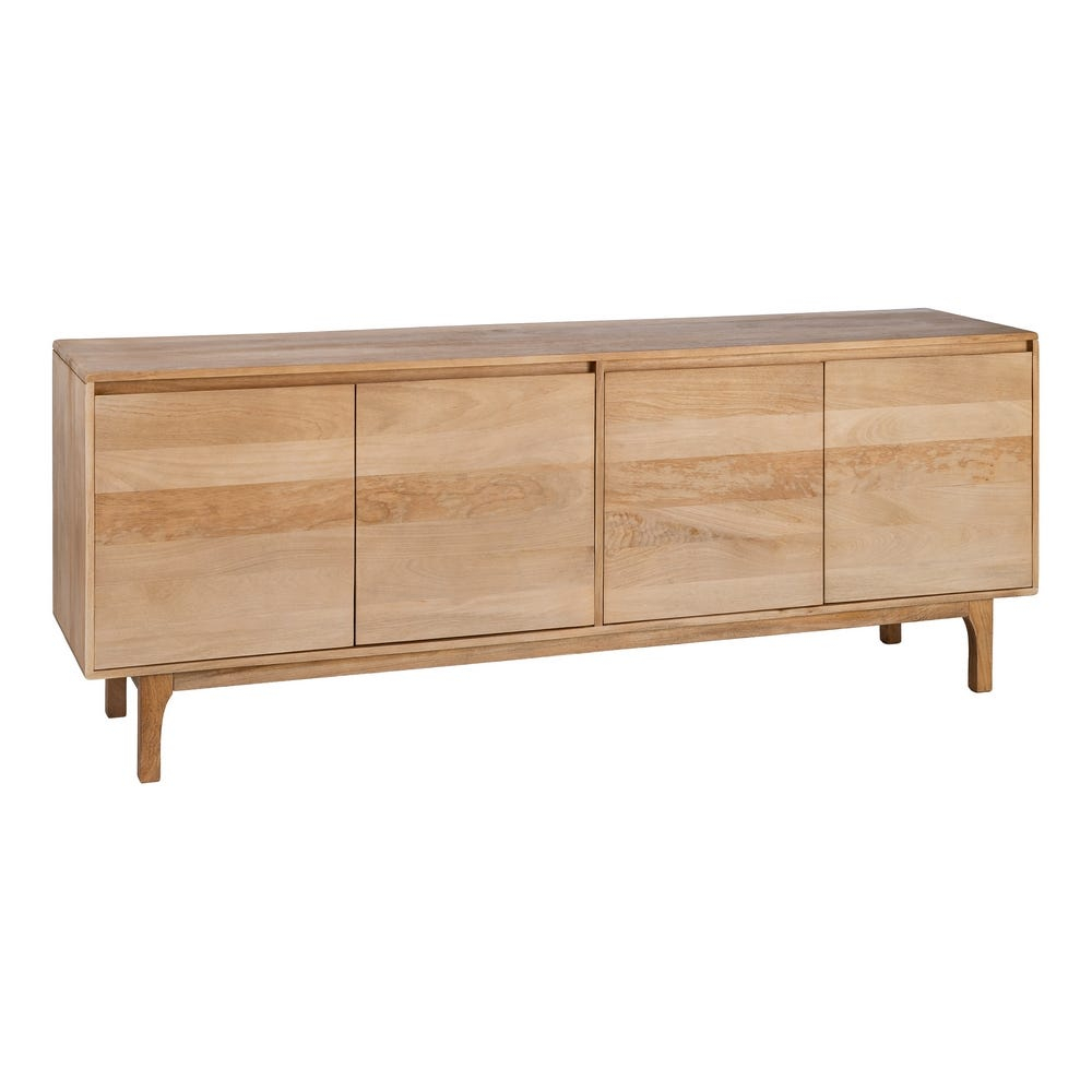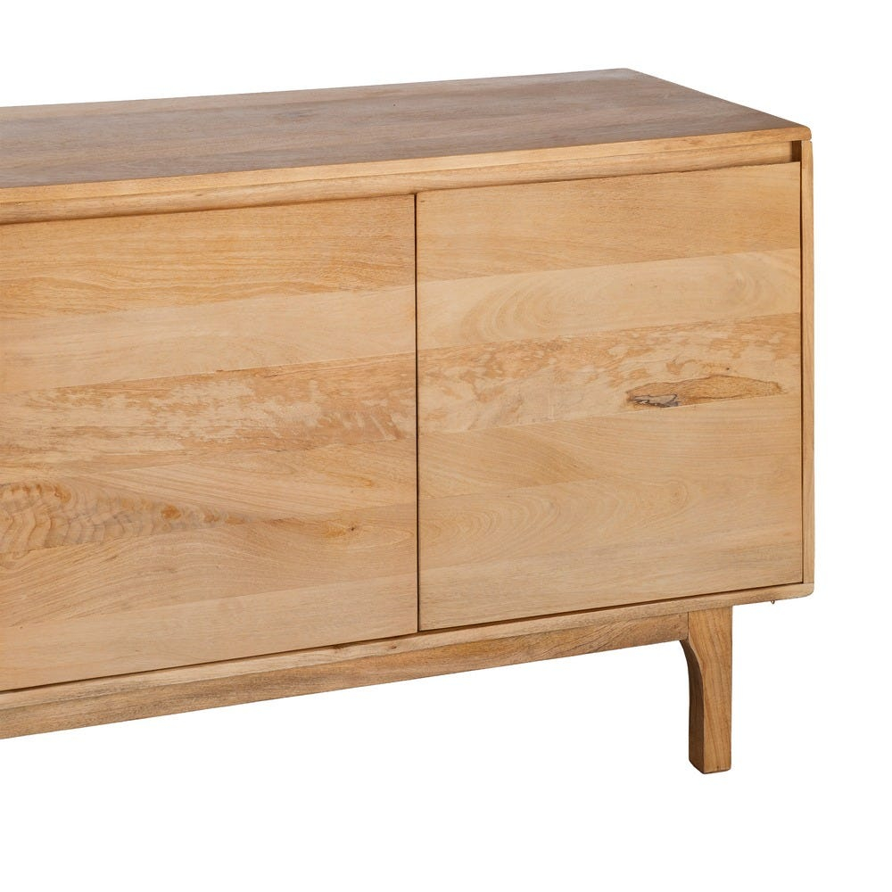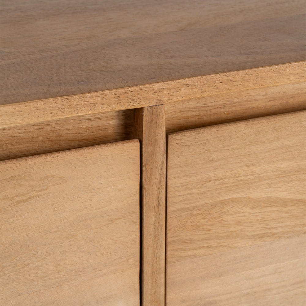 Structura bufetului este realizată integral din lemn de mango, cu un corp rectangular bine definit și fronturi plane care evidențiază continuitatea fibrei lemnului. Volumul este susținut de picioare discrete, ușor retrase, care oferă stabilitate vizuală și un aspect aerisit ansamblului.