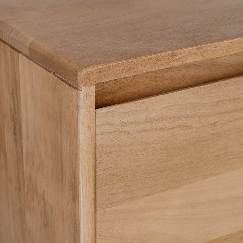 Textura naturală a lemnului este lăsată vizibilă pe toate suprafețele, cu variații subtile de nuanță și fibră ce conferă piesei un caracter autentic. Designul lipsit de ornamente suplimentare susține o estetică minimalistă și permite integrarea bufetului în amenajări contemporane, naturale sau cu accente nordice.