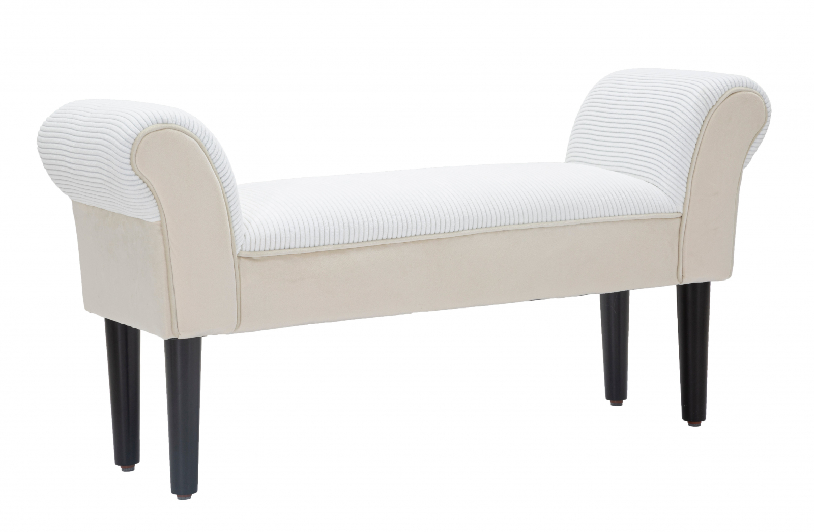Bancuta tapitata eleganta. Tapițeria din catifea crem combinata cu cea alba raiata, oferă o atmosfera cozy, un confort sporit cu aspect luxos, în timp ce picioarele din lemn negru aduc un contrast modern și stilat. Perfectă pentru holuri, livinguri sau la capătul patului, această banchetă se integrează armonios în stiluri de design variate, de la glamour la modern sau minimalist, fiind o alegere rafinată pentru orice locuință.