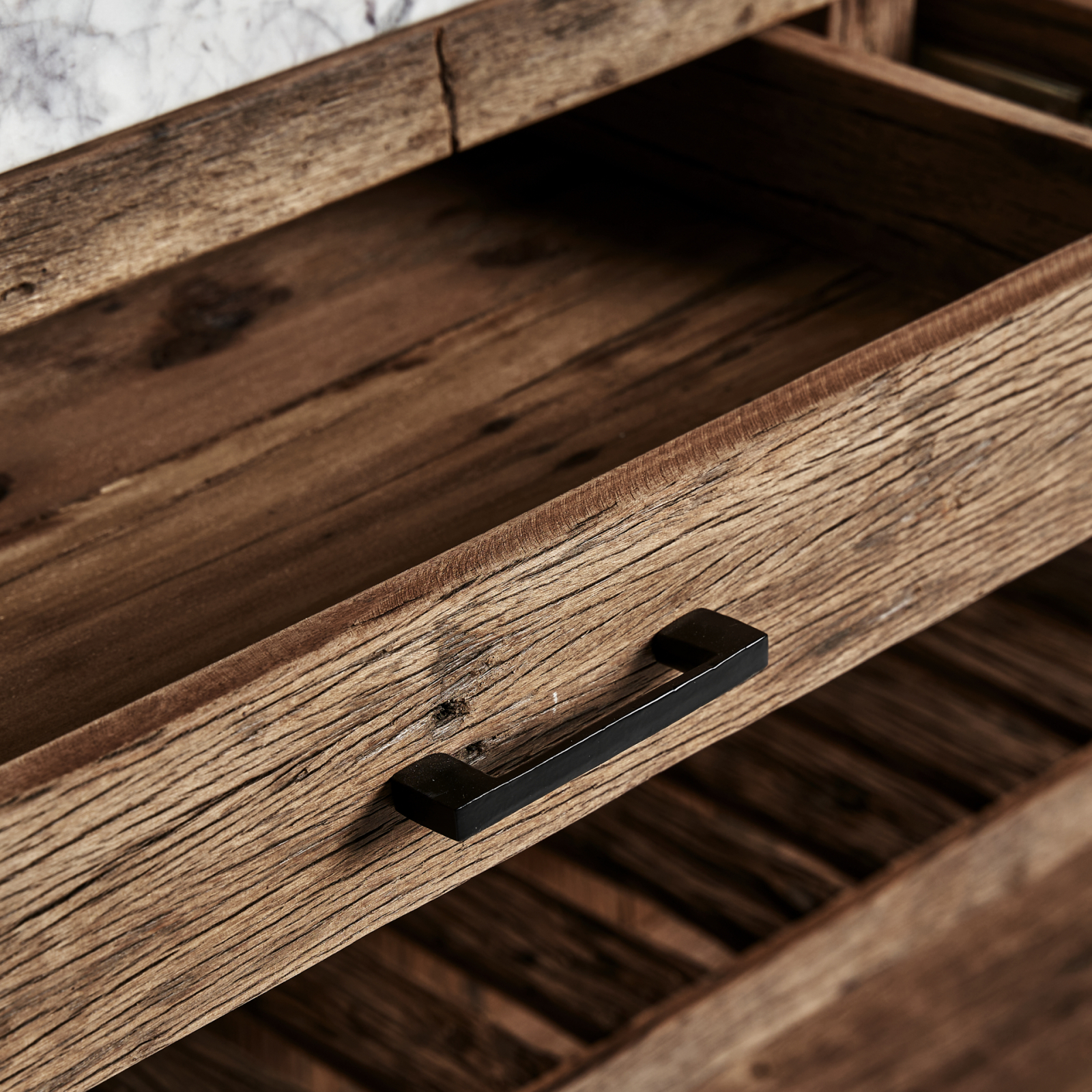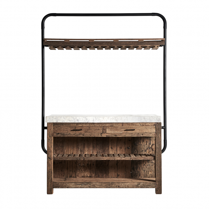 Bar din lemn de pin reciclat negru și natural în stil industrial, creat manual din lemn de pin reciclat, marmură și fier. Cu dimensiuni impresionante de 166 cm lungime, 82 cm lățime și 235 cm înălțime, această piesă demontabilă aduce un contrast dramatic între lemn și metal în orice spațiu. Barurile industriale din lemn reciclat sunt apreciate pentru aspectul lor robust și sustenabilitatea materialelor. Combinația de negru și natural oferă un contrast puternic și interesant. Importat de CreativDeco, acest bar de calitate spaniolă cântărește 185,8 kg și este ideal pentru a crea un punct focal impresionant în bucătărie, living sau zone de dining, aducând un touch de stil industrial și sustenabilitate în casa dumneavoastră.