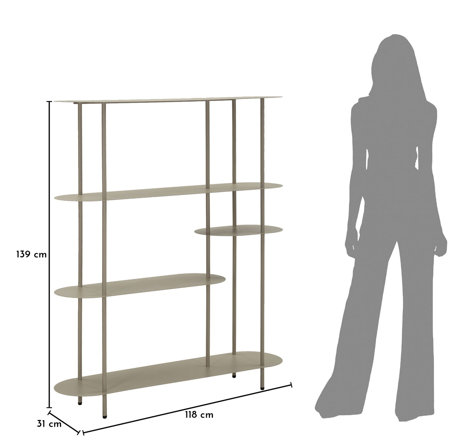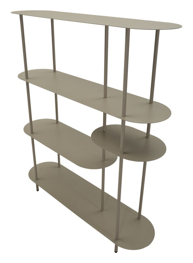 Bibliotecă metalică modernă cu polițe ovale dispuse pe niveluri finisaj gri taupe design minimalist elegant 118 x 31 x 139 cm