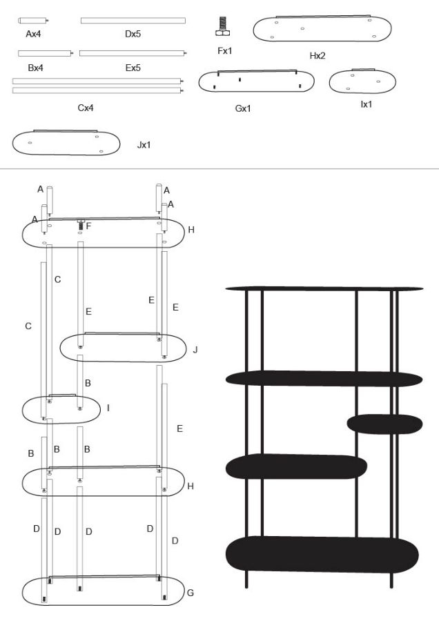 Structura metalică subțire susține mai multe polițe cu forme organice care creează un ritm vizual elegant și dinamic. Spațiul generos permite expunerea cărților, a obiectelor decorative sau a plantelor, oferind în același timp o organizare armonioasă a interiorului.