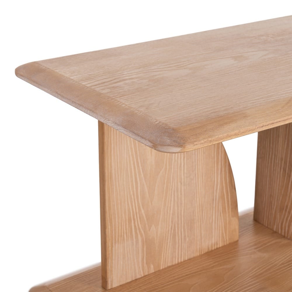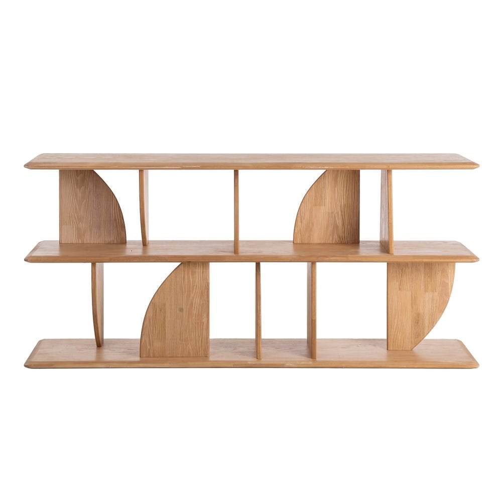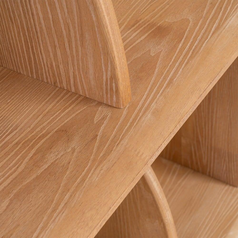 Structura arhitecturală, cu polițe dispuse asimetric și două module închise, creează un ritm grafic plăcut care dinamizează peretele fără a încărca vizual încăperea. Lemnul deschis, cu por deschis, aduce căldură și naturalețe, integrându-se impecabil în decoruri scandinave, japandi sau modern minimaliste.