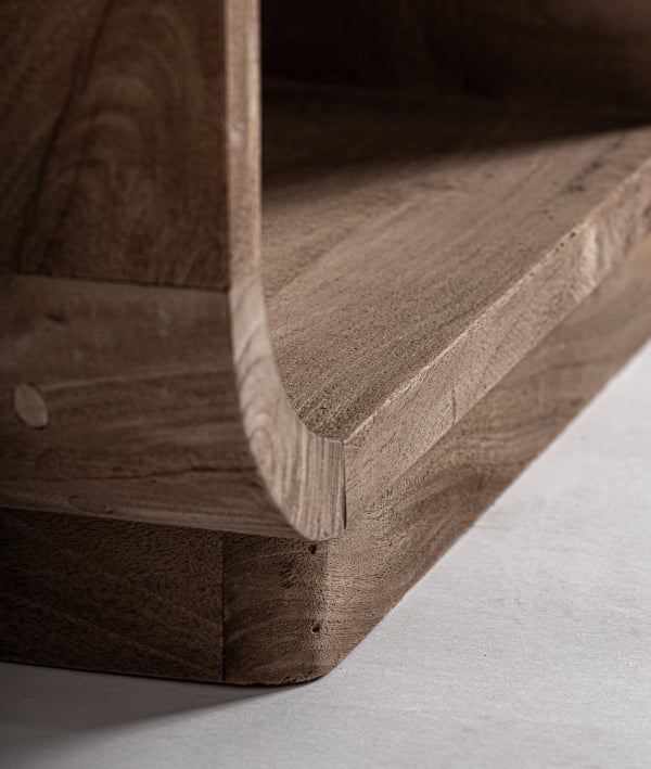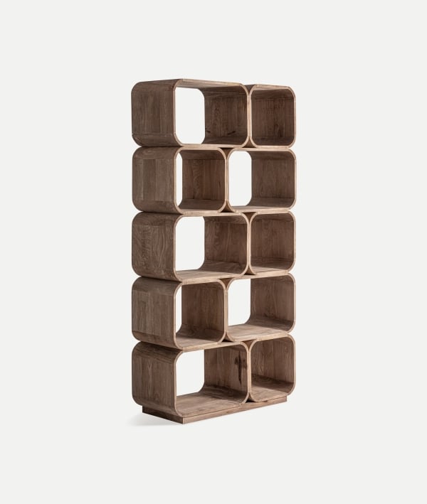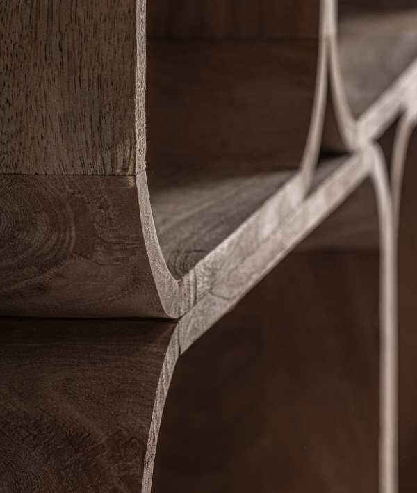 FLOW impresionează prin forma sa curbilinie și prin dispunerea neregulată a modulelor, care oferă un ritm vizual aparte. Realizată manual din lemn masiv de mango, biblioteca combină rezistența materialului natural cu un aspect sculptural, transformând depozitarea într-un exercițiu estetic.