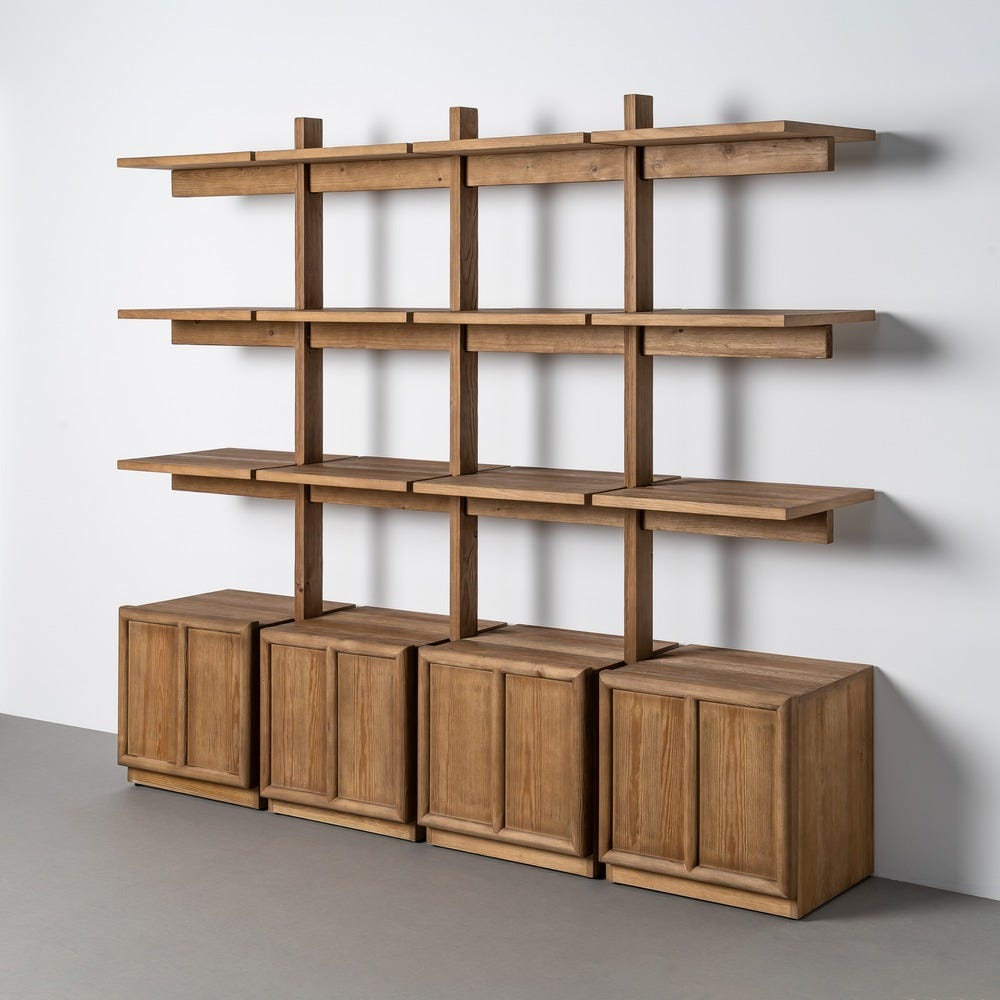 Este o bibliotecă modulară din lemn de pin, cu rafturi deschise și module de depozitare închise.