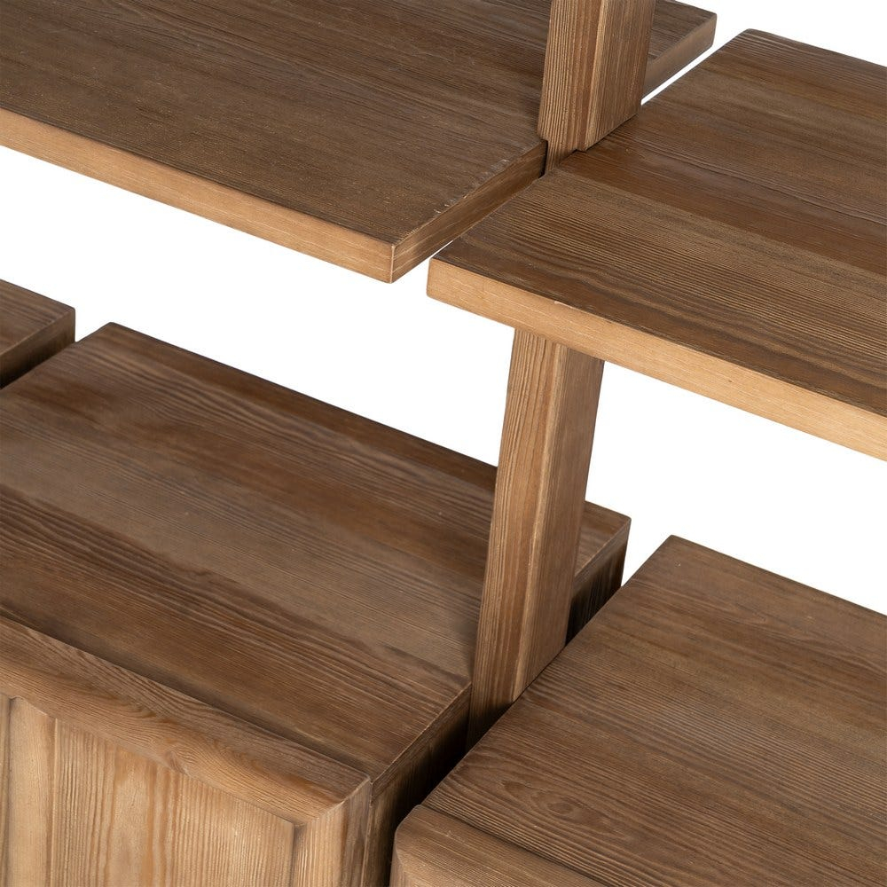 Lemnul de pin, cu textura sa naturală și nuanțele calde, aduce un aer autentic și relaxat, specific interioarelor cu influențe rustice, scandinave sau farmhouse modern. Rafturile deschise permit expunerea cărților, ceramicii sau obiectelor decorative, în timp ce corpurile de la bază oferă spațiu generos pentru depozitare.