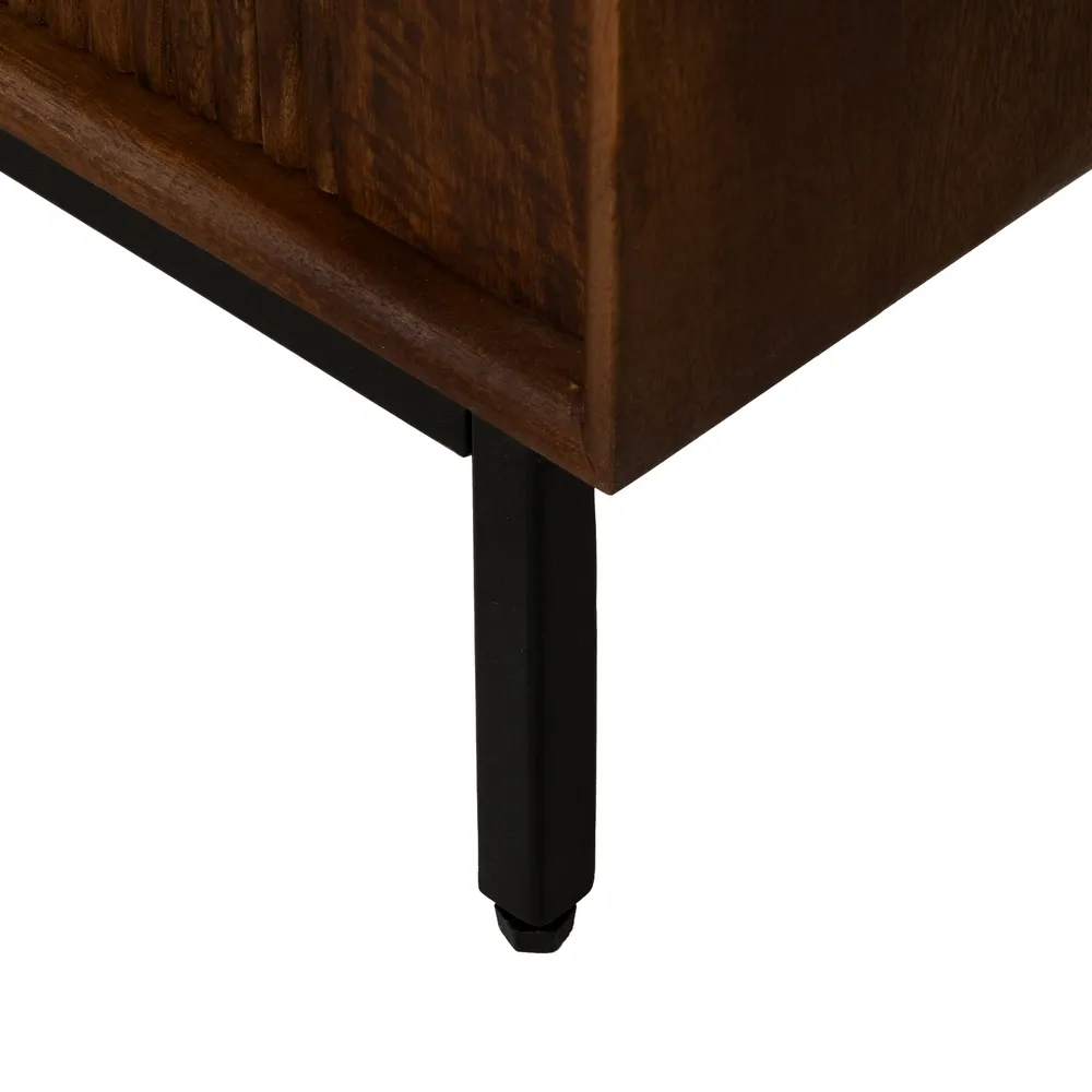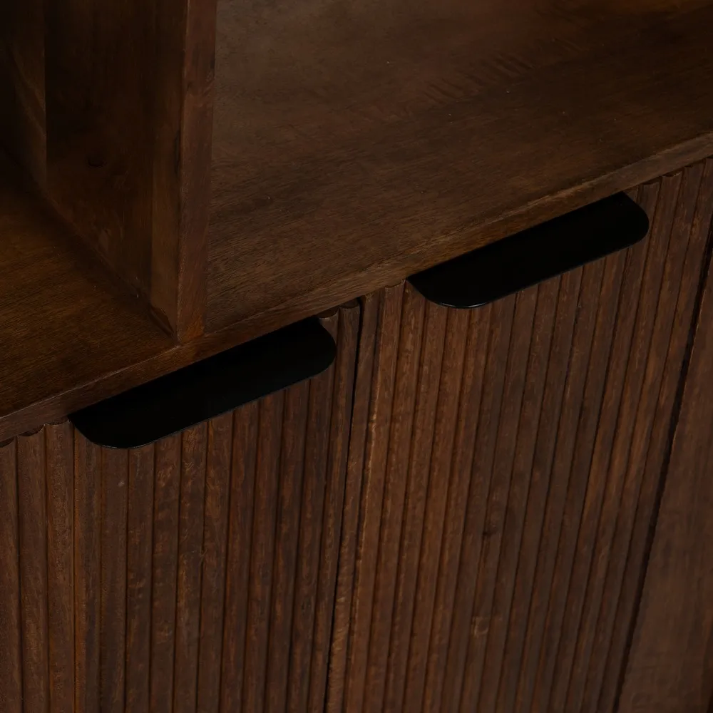Această bibliotecă îngustă, cu dimensiuni de 60 cm lățime, 30 cm adâncime și 190 cm înălțime, este o piesă de mobilier elegantă și funcțională. Fabricată din lemn de mango de înaltă calitate, biblioteca prezintă un design minimalist îmbogățit de suprafața în relief a ușilor, care pune în evidență striatiile naturale ale lemnului. Picioarele negre din metal, cu o înălțime de 13 cm, adaugă stabilitate și un contrast modern. Designul rafturilor este deosebit, cu înălțimi variate (37/47/22,5 cm) care oferă posibilități creative de aranjare a cărților și obiectelor decorative. Ușile de 28,5x46 cm ascund spațiu suplimentar de depozitare. Faptul că are picioare ușurează întreținerea curățeniei și conferă o atmosferă aerisită în încăpere. Această creație a designerilor spanioli, disponibilă prin CreativDeco, va adăuga cu siguranță stil și funcționalitate în orice living, birou sau dormitor.