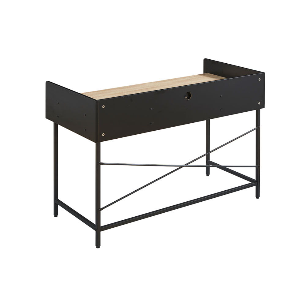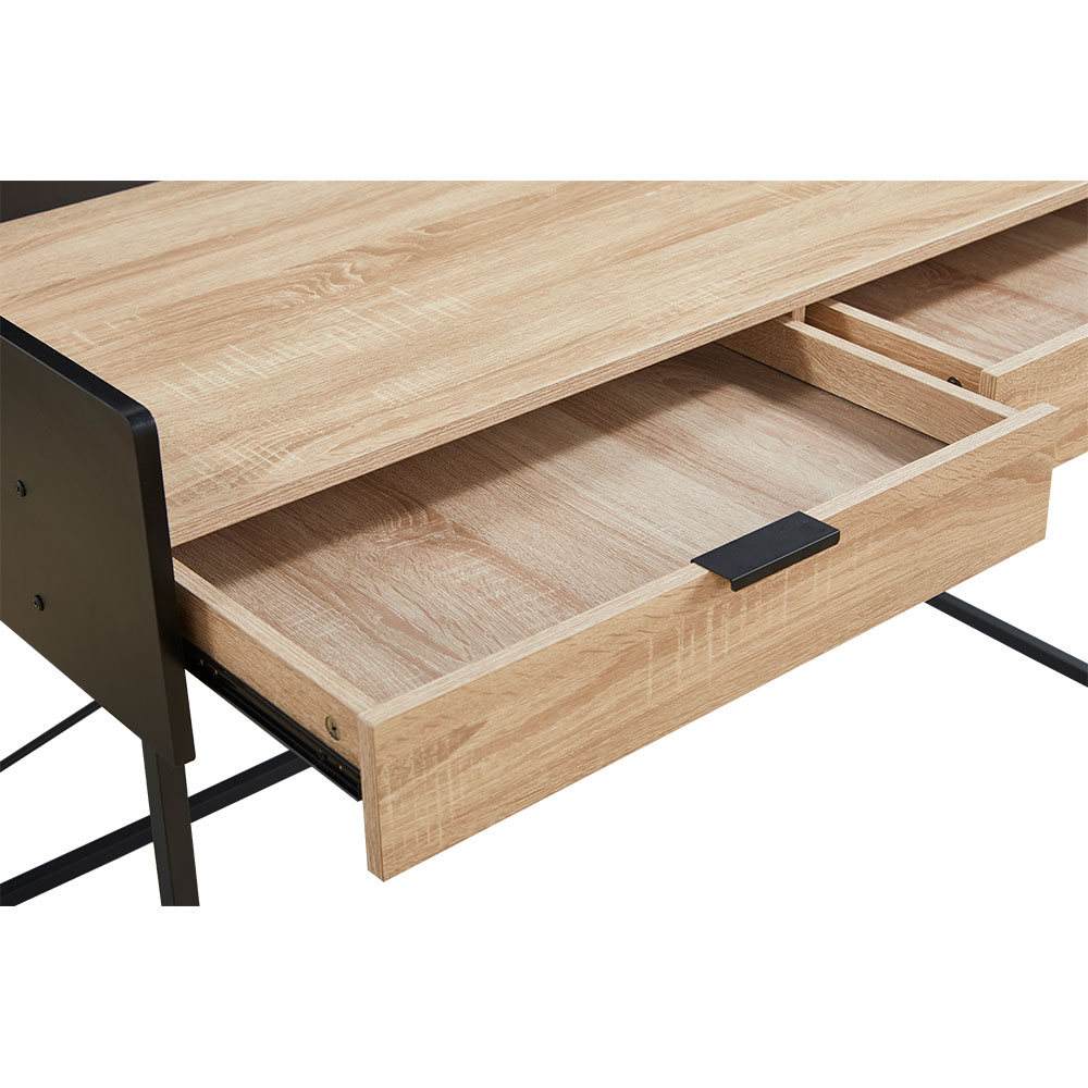 Biroul cu 2 sertare, model Homi, în finisaj natural și detalii negre moderne, este alegerea ideală pentru un dormitor spațios sau pentru un colț de lucru amenajat discret în living. O piesă funcțională, care combină stilul contemporan cu utilitatea de zi cu zi.