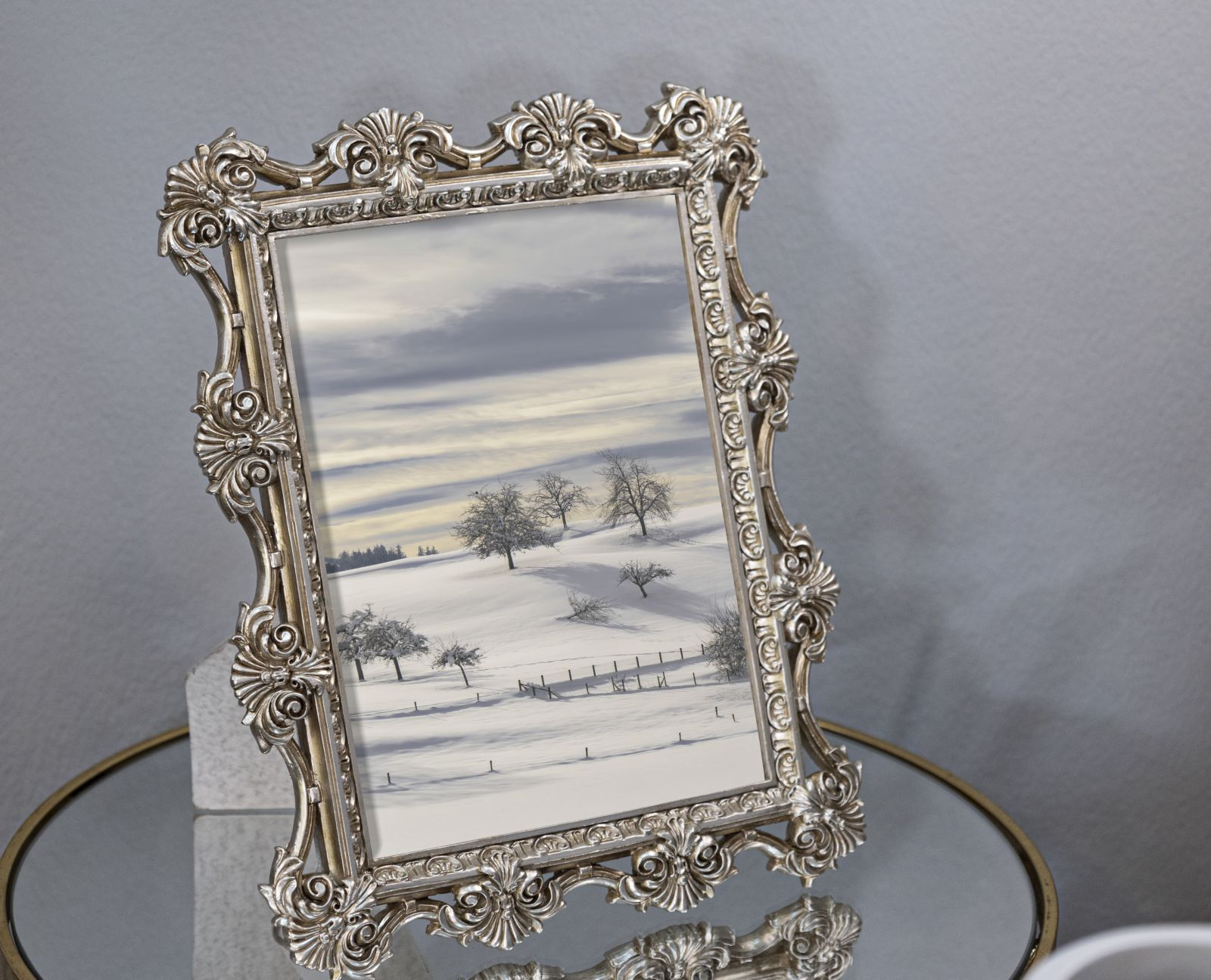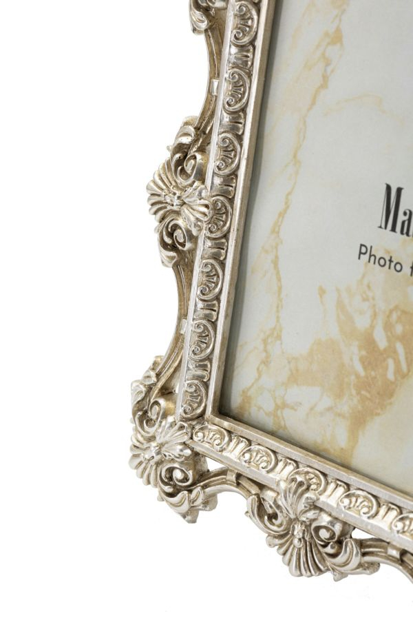 Rame foto argintii din rășină cu contur bogat decorat, inspirat din motive baroce, ideale pentru a transforma fotografiile în obiecte de decor. Detaliile sculpturale și finisajul argintiu adaugă caracter și subliniază frumusețea imaginilor expuse.