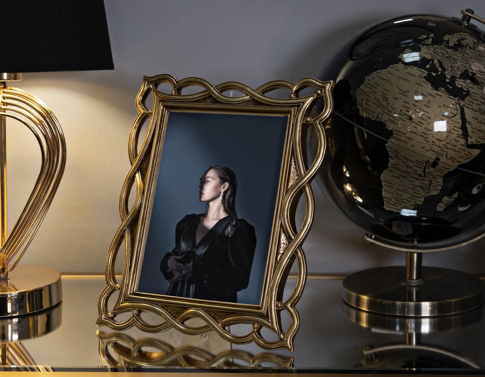 Forma sculpturală a ramei, cu linii curbe și dinamice, adaugă energie compoziției și transformă fotografia într-o piesă centrală a decorului. Finisajul auriu pune în valoare detaliile și se integrează cu ușurință în interioare moderne sau clasice.