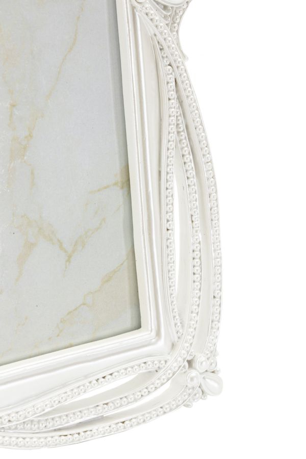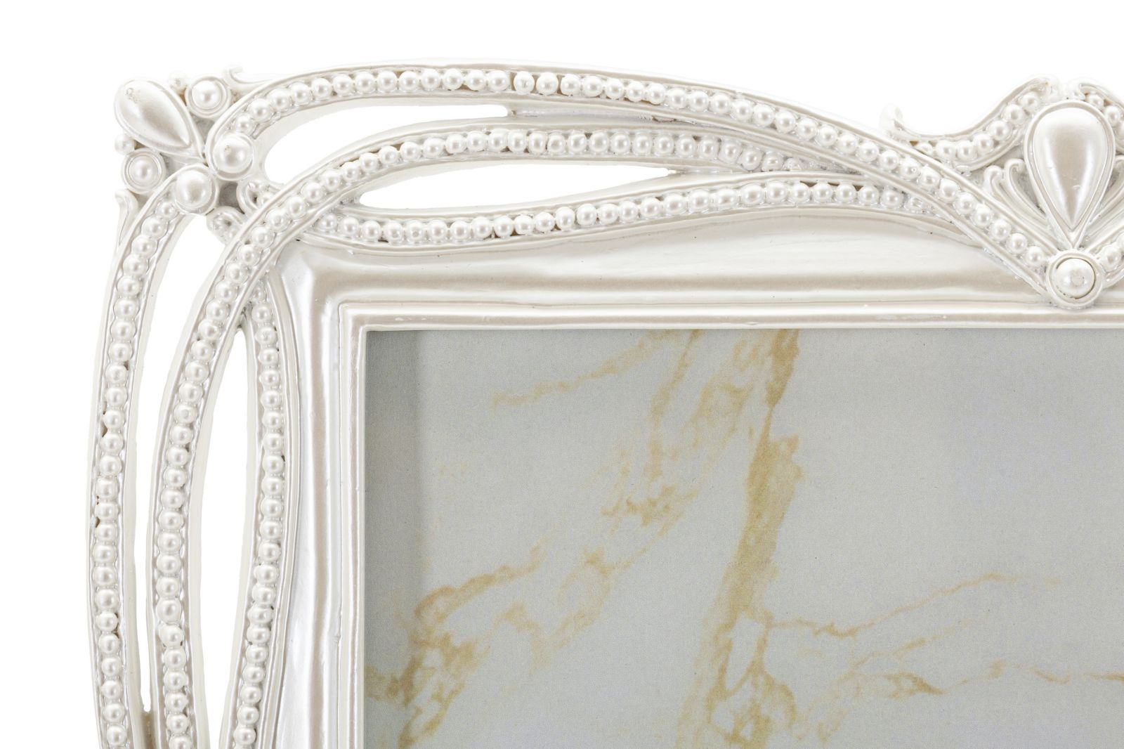 Rame foto din rășină, finisaj alb cu luciu satinat, conturate de un motiv de panglică și mărgele decorative în relief. Silueta fluidă pune discret în cadru fotografii 20x25 cm și se potrivește atât decorurilor moderne, cât și celor clasice.