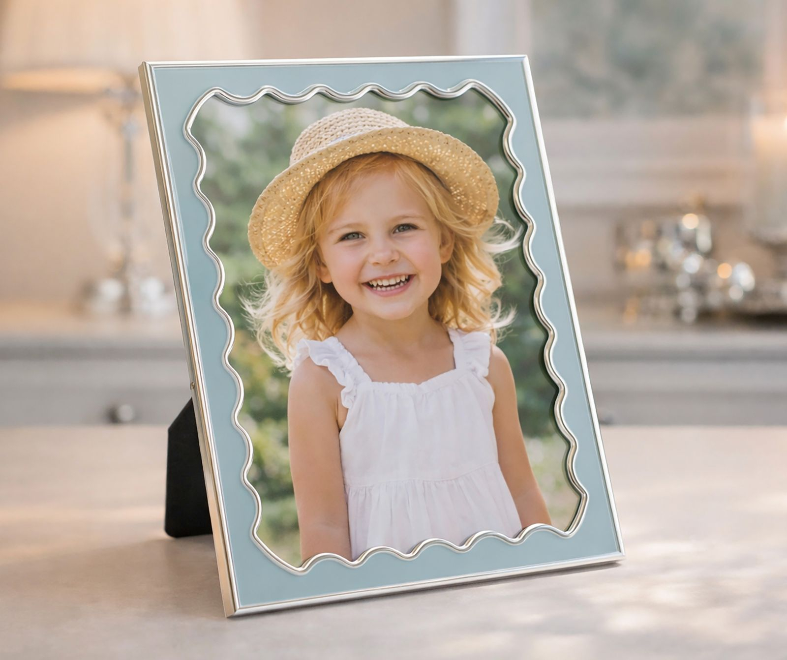 Setul de 2 rame foto Juliette în nuanță albastru deschis cu detalii argintii propune aceeași linie delicată într-un format mai compact, potrivit pentru fotografii de 12.5x17.5 cm. Profilul ondulat și bordura pastelată creează un efect vizual fin și romantic, ideal pentru a evidenția momente intime într-un decor luminos și atent amenajat.