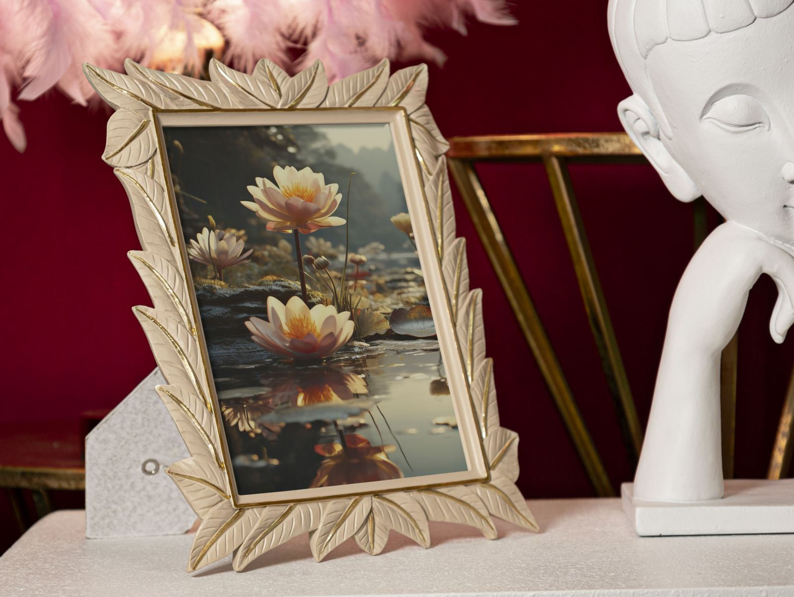 Modelul se distinge prin conturul sculptural realizat sub formă de frunze aurii, cu linii delicate și accente fine. Această compoziție oferă un cadru deosebit pentru fotografii, adăugând un element decorativ de impact atât pe masă, cât și pe un raft sau birou.
