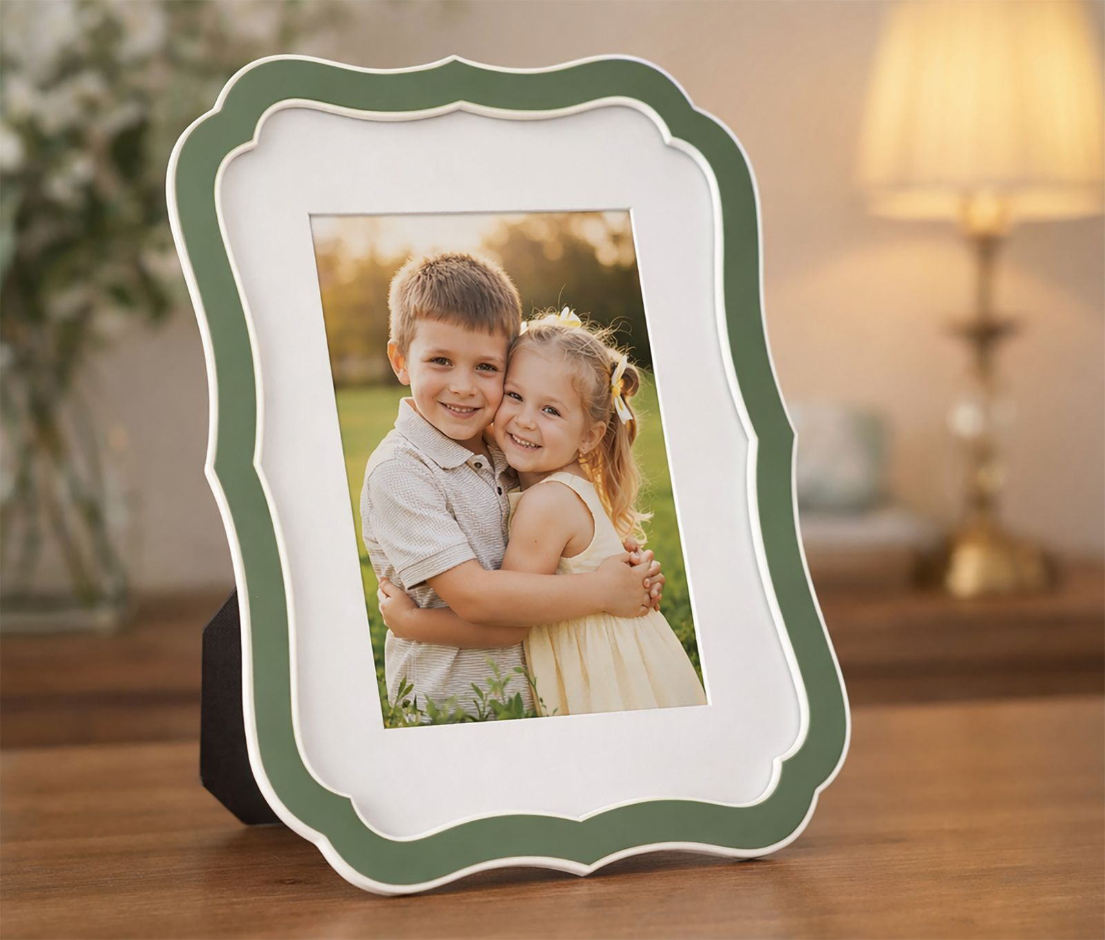 Realizate din metal și completate cu sticlă de protecție, ramele sunt evidențiate de conturul armonios subliniat subtil de detaliile argintii. Verdele intens al marginii creează un contrast elegant cu interiorul deschis, punând în valoare fotografia și oferind un efect vizual clar și ordonat.