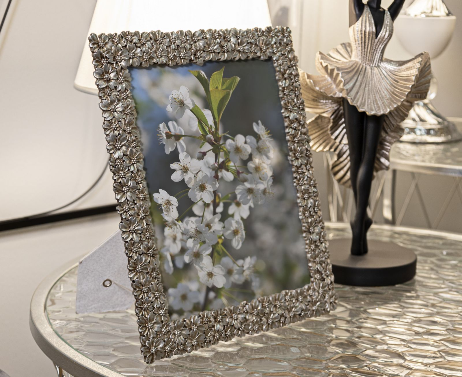 Rame foto argintii din rășină cu flori reliefate pun în valoare imaginile 20×25 cm prin detalii elegante. Setul de 2 adaugă un accent sofisticat în orice încăpere. Flowy.