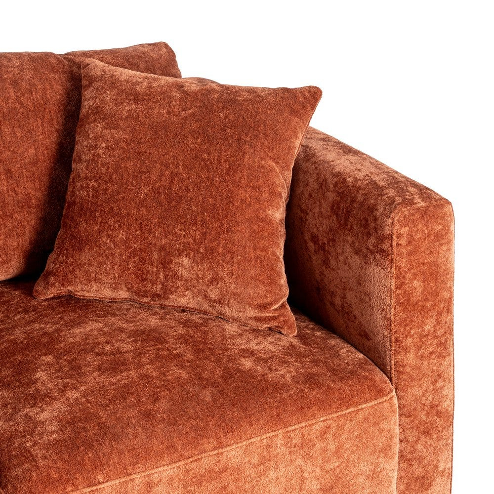 Tonul cald de teracotă și textura catifelată a țesăturii creează o atmosferă primitoare și sofisticată, ideală pentru momentele de relaxare. Forma cubică și liniile curate completează aspectul modern, transformând această canapea într-o piesă centrală în decorul contemporan al casei tale.