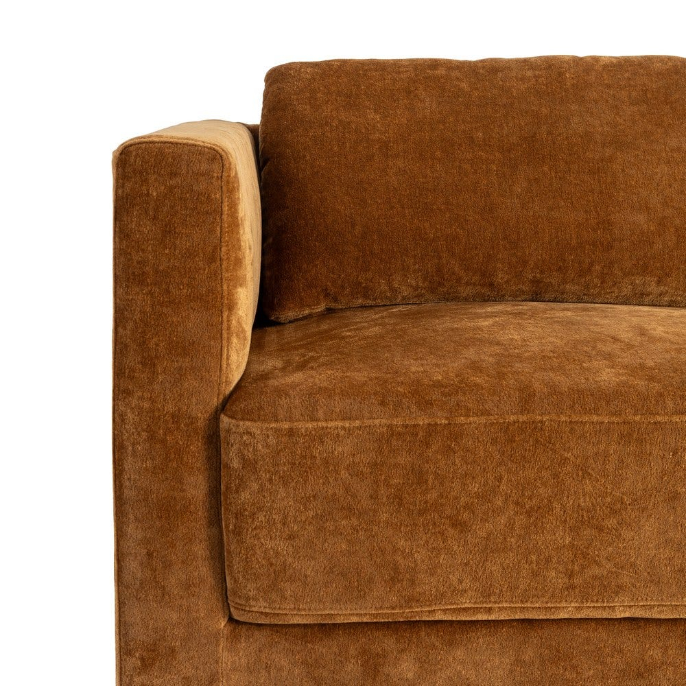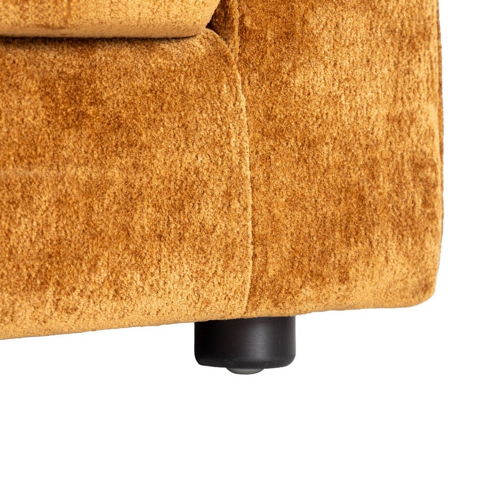 Tonul cald de ocru și textura catifelată a țesăturii creează o atmosferă primitoare și elegantă, potrivită atât pentru interioare moderne, cât și clasice. Forma cubică și liniile simple conferă un aspect ordonat și sofisticat, transformând această canapea într-o piesă centrală a livingului.