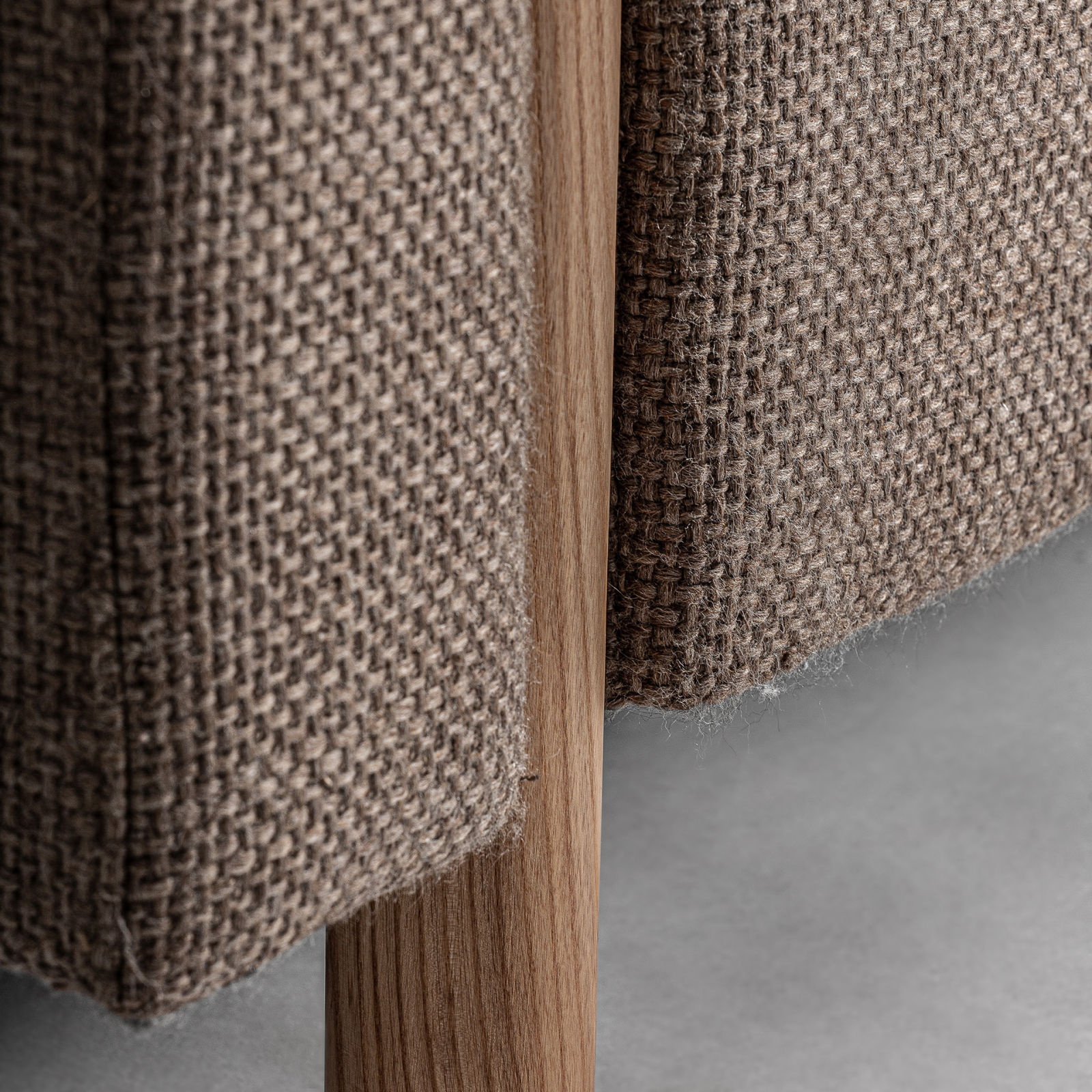 Tapiseria într-o nuanță caldă de bej, cu textură fină, este completată de structura vizibilă din lemn în ton deschis, aducând un aer natural și primitor. Detaliile ușor clasice, precum capitonajul discret al spătarului, adaugă profunzime fără să încarce vizual.