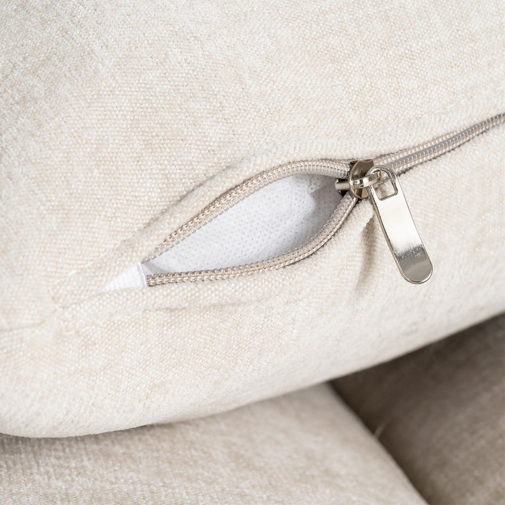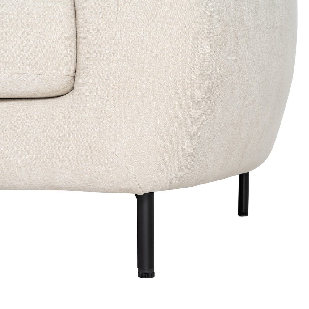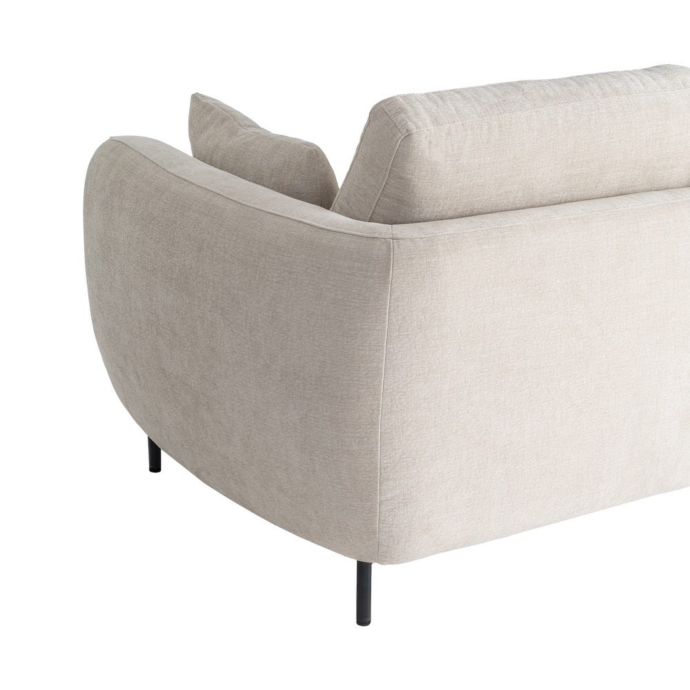 Canapeaua este realizată din stofă crem, cu o textură uniformă care pune în valoare liniile fluide ale brațelor și suprafața continuă a șezutului. Pernele de spătar și cele laterale sunt integrate armonios, contribuind la un aspect primitor și bine definit.