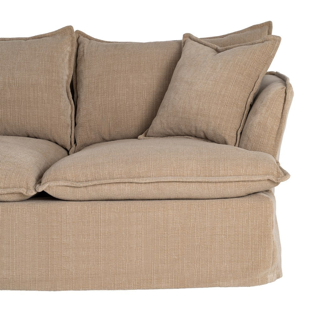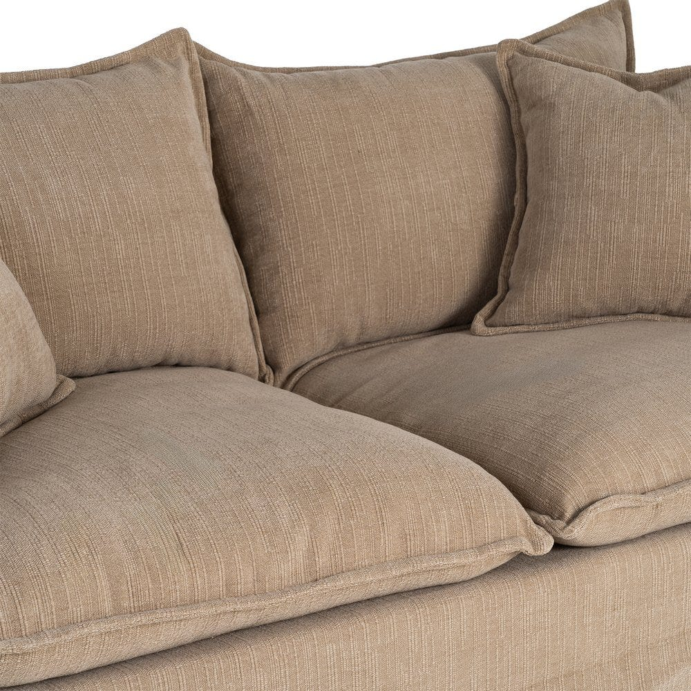 Șezutul este realizat din perne ample cu umplutură din dublă pluma, oferind un confort moale și relaxant, ideal pentru utilizarea zilnică. Spătarul și pernele laterale completează aspectul primitor al canapelei și susțin o poziție comodă de ședere.