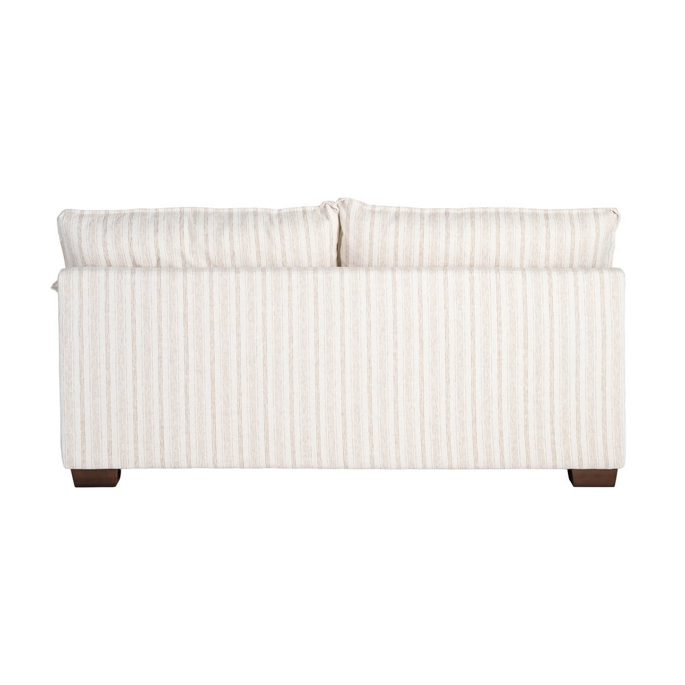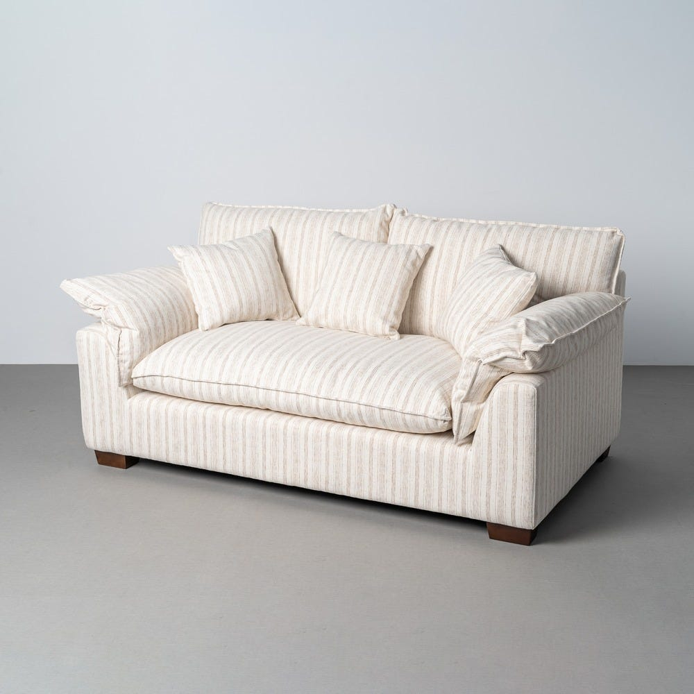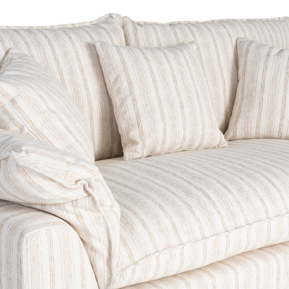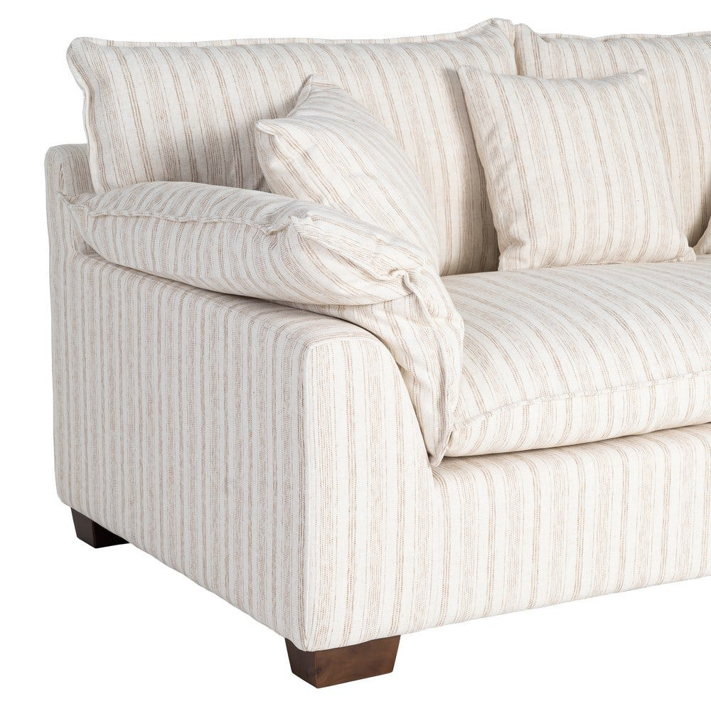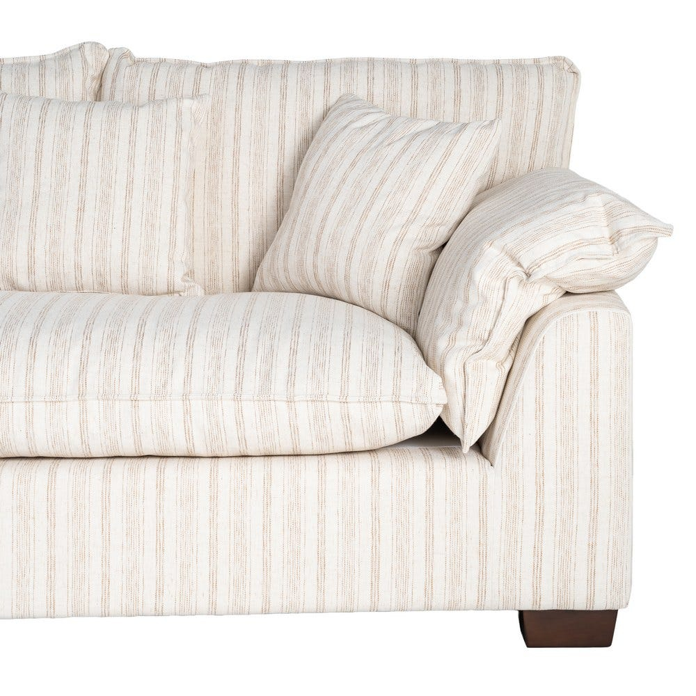 Șezutul este realizat dintr-o pernă amplă cu umplutură din dublă pluma, oferind o senzație moale și primitoare. Spătarul este completat de perne voluminoase, iar dunga subtilă a stofei adaugă profunzime vizuală fără a încărca spațiul.