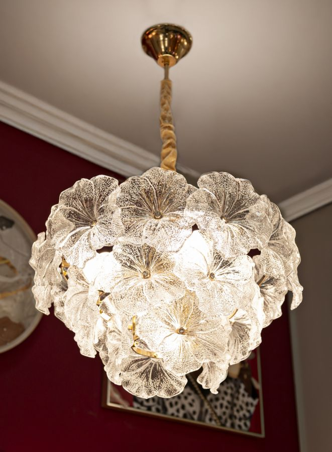 Candelabrul suspendat Ibiscus impresionează prin designul floral spectaculos, realizat din elemente din sticlă transparentă lucrată cu detalii fine, completate de accente aurii elegante. Este o piesă de iluminat care transformă instant atmosfera într-un spațiu sofisticat și rafinat.