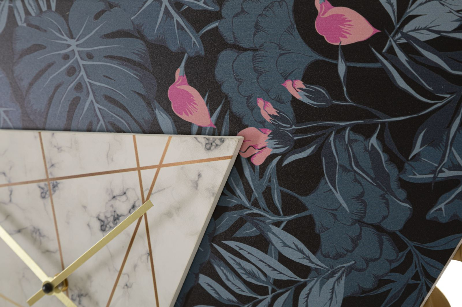 Adaugă un accent artistic și modern în living, birou sau dormitor cu acest ceas de perete cu design geometric. Forma triunghi în triunghi, combinată cu inserții florale delicate și un efect marmură pentru unul dintre triunghiuri, creează un obiect decorativ unic, care atrage privirile și adaugă stil spațiului tău.