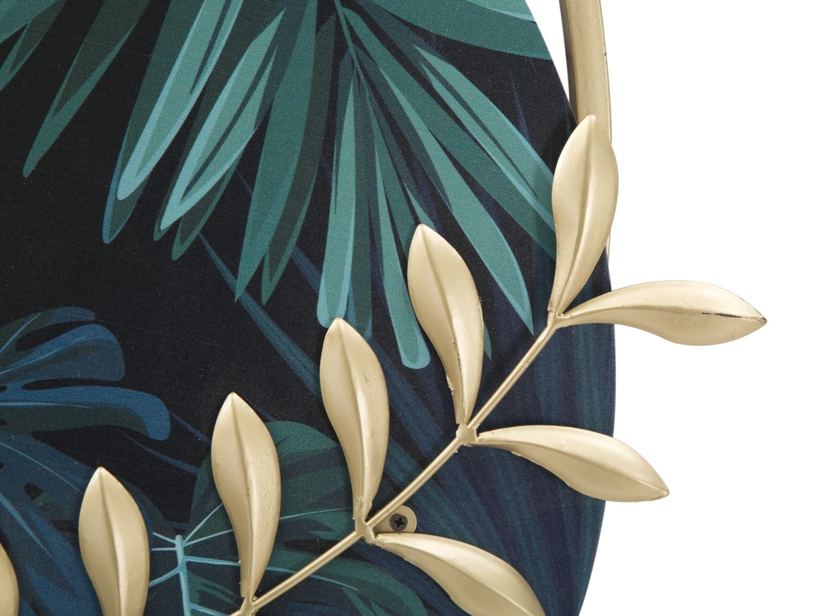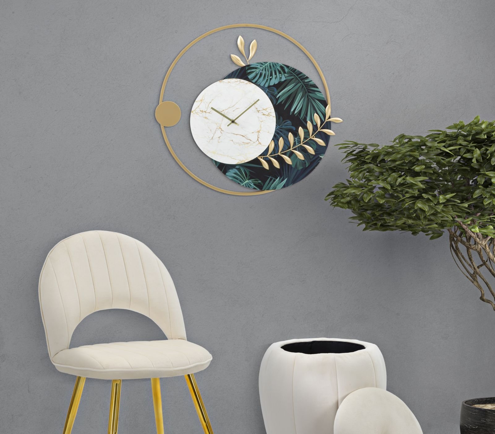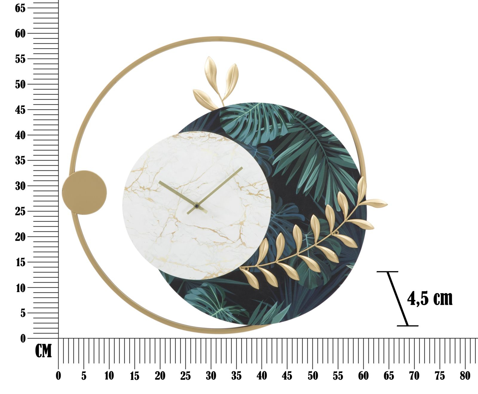 Acest ceas de perete este realizat din fier și MDF, combinând culoarea aurie cu albul cadranului și nuanțe de verde. Elementele de decor sunt plăcute, naturale, de la cercurile ca element central de design, la formele naturale ale frunzelor verzi sau auriul frunzelor realizate din metal. Cumpără acest ceas pentru living, hol sau bucătărie, dacă ai nevoie de un discret accent de culoare sau de un element natural în locuința ta.