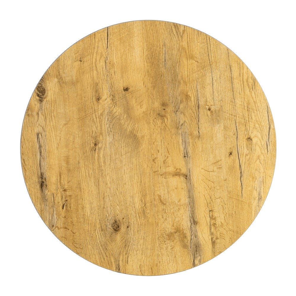 Blat de masă rotund HPL aspect lemn natural pentru HoReCa, bistrouri, cafenele și terase, cu textură caldă și senzație autentică, potrivit pentru interior și exterior.