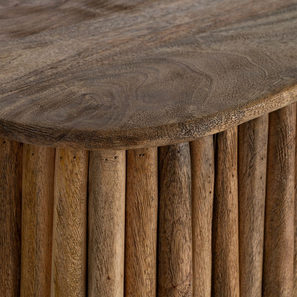 Lemnul de mango este apreciat pentru durabilitatea sa și pentru desenul natural al fibrei, fiecare piesă fiind unică prin variațiile de culoare și textură. Frontul canelat adaugă profunzime și ritm, transformând bufetul într-un element decorativ în sine, nu doar într-o piesă de depozitare.