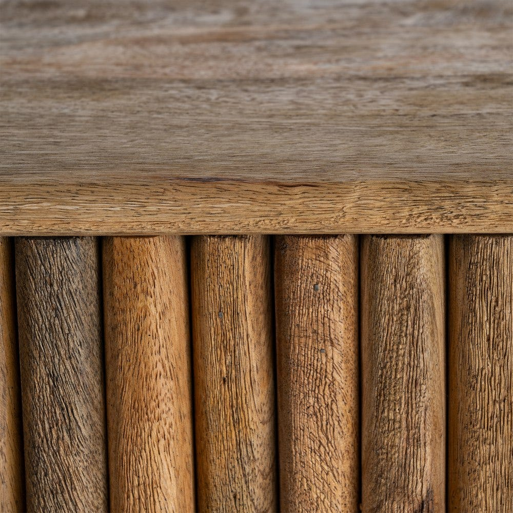 Acest bufet din lemn de mango se remarcă printr-un design cald și autentic, definit de un front canelat realizat din șipci verticale din lemn masiv. Textura naturală, ușor neregulată, și nuanțele organice ale lemnului creează o prezență vizuală puternică, dar echilibrată, specifică stilului rustic contemporan.