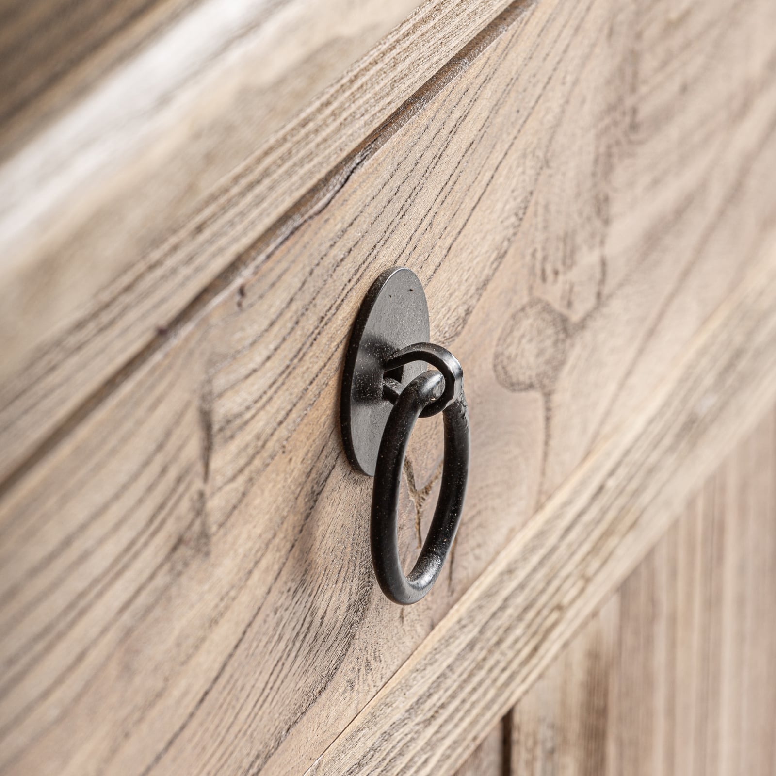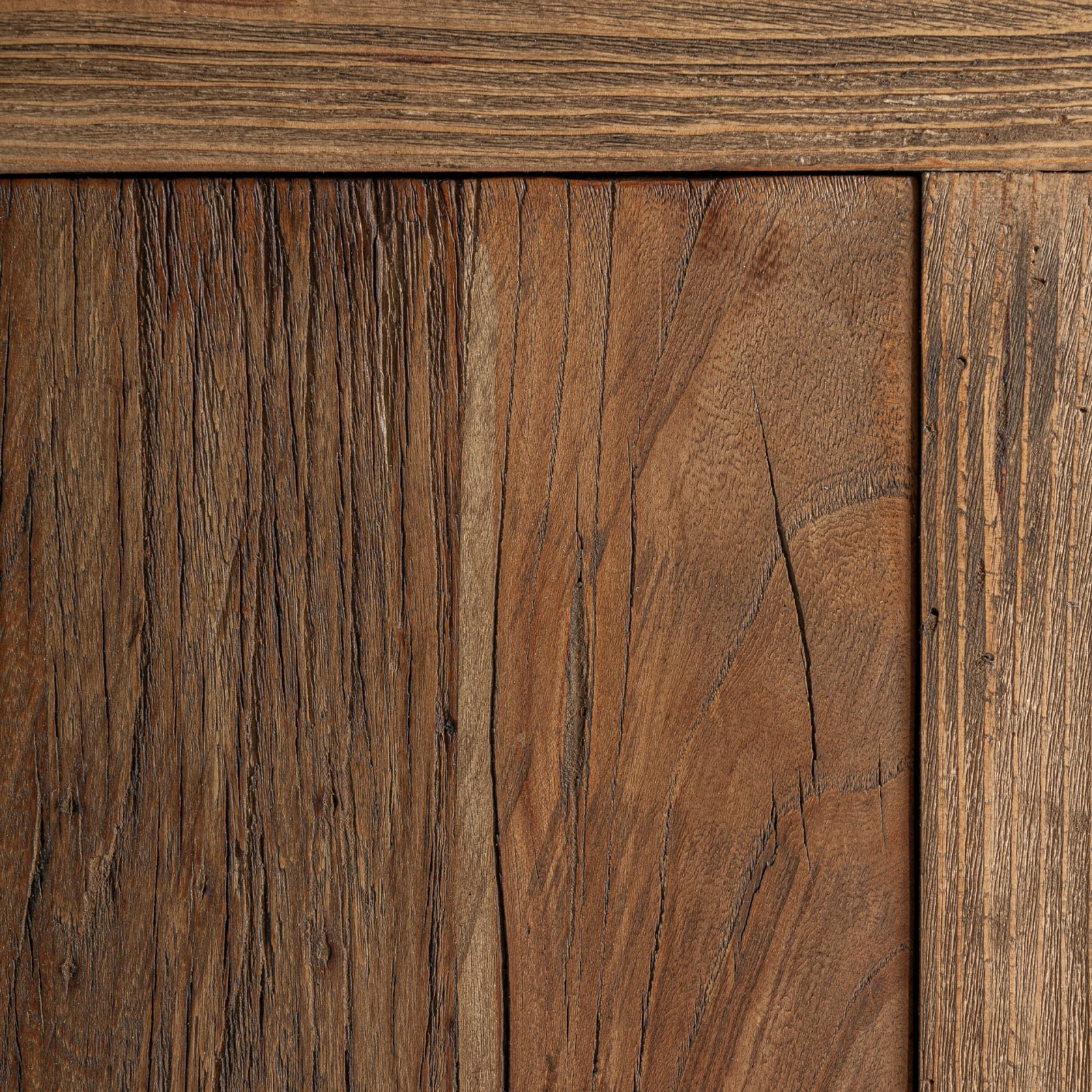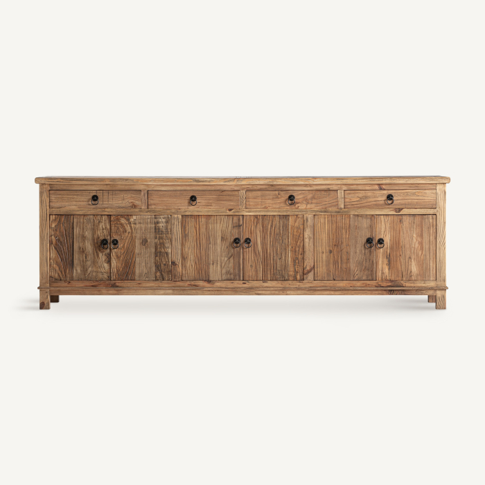 Acest bufet reunește autenticitatea lemnului de ulm cu o prezență robustă și caldă, oferind o soluție de depozitare generosă pentru orice amenajare care pune preț pe materialele naturale și pe detaliul lucrat manual.