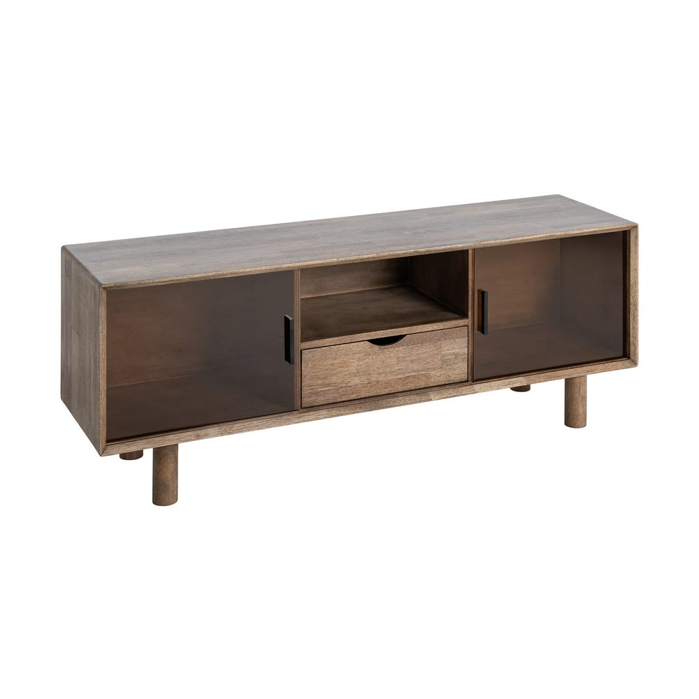 Structura este realizată din lemn de cauciuc cu finisaj maro, care evidențiază textura naturală a materialului. Comoda include două compartimente laterale închise cu uși din sticlă securizată, un sertar central și un spațiu deschis dedicat echipamentelor media, oferind o compartimentare clară și echilibrată.