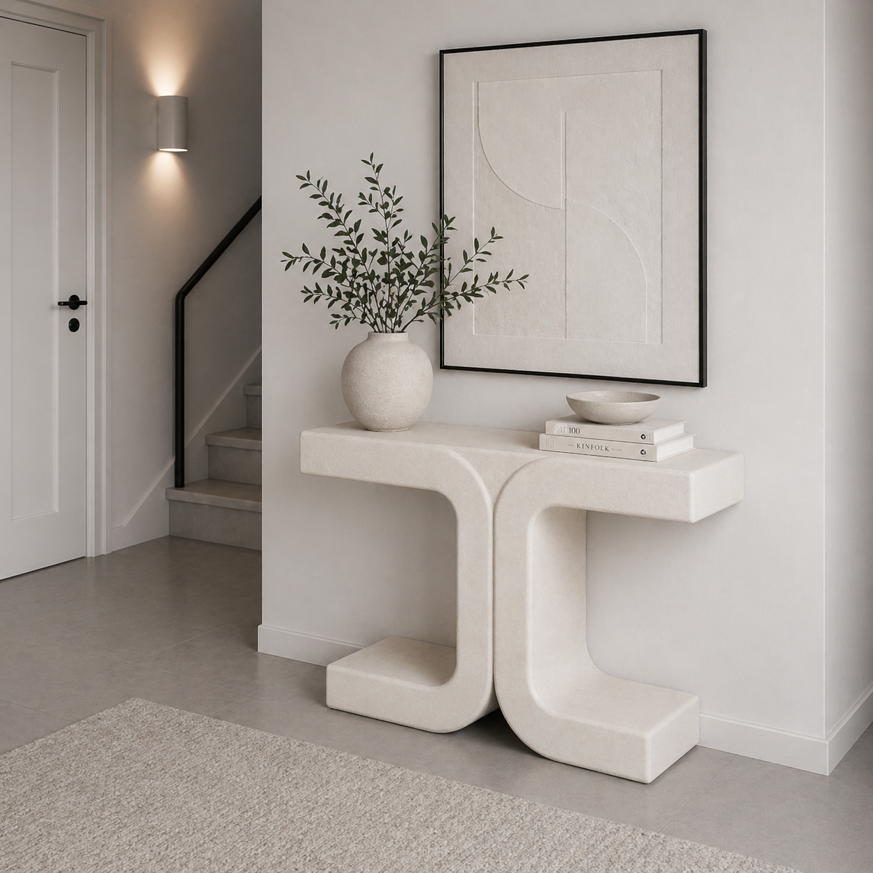 Sfatul designerului CreativDeco: folosește consola pe un perete simplu și lasă forma ei să fie în prim-plan. Adaugă un singur obiect decorativ sau o oglindă cu design curat pentru a păstra un aspect aerisit.