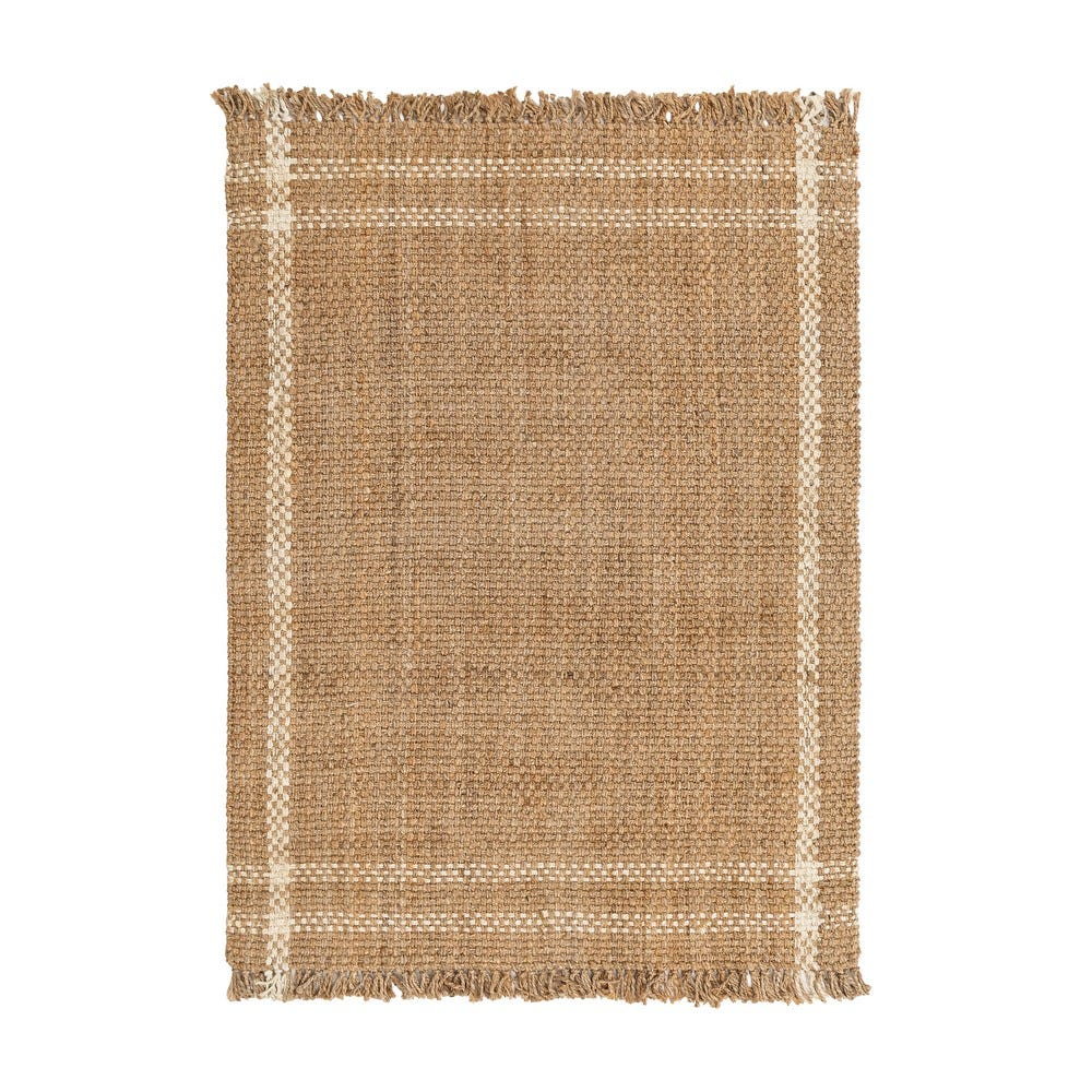 Țesătura din iută, împreună cu bordurile albe tip ramă, creează o compoziție netedă și naturală, iar franjurii scurți adaugă o notă relaxată la capete. Paleta neutră se leagă ușor de lemn deschis, ratan și textile din bumbac sau in, astfel încât covorul devine un strat cald într-un interior luminos.