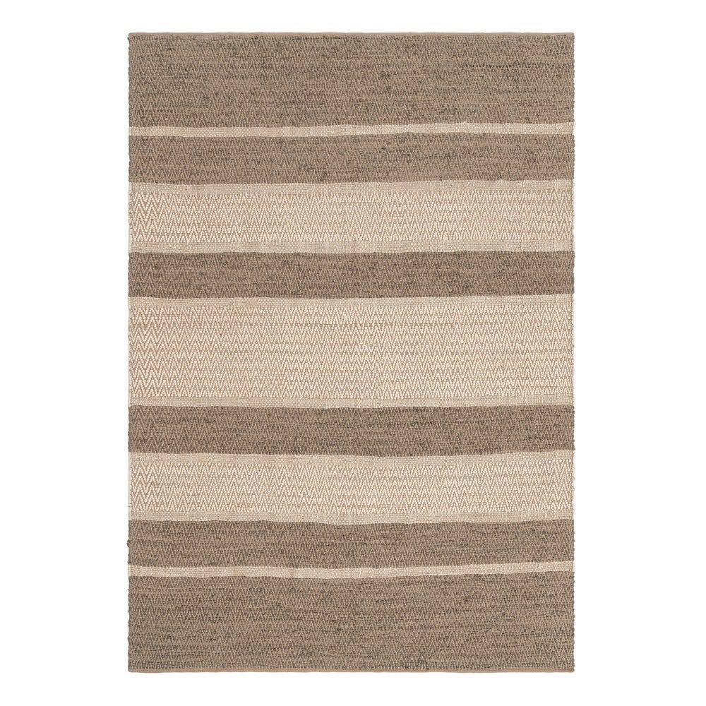 Textura de bumbac așază un ritm calm în cameră: benzile gri-bej încălzesc vizual spațiul și creează legătura dintre canapea, măsuță și fotolii, fie într-un living aerisit, fie într-o zonă de dining cu lemn deschis.