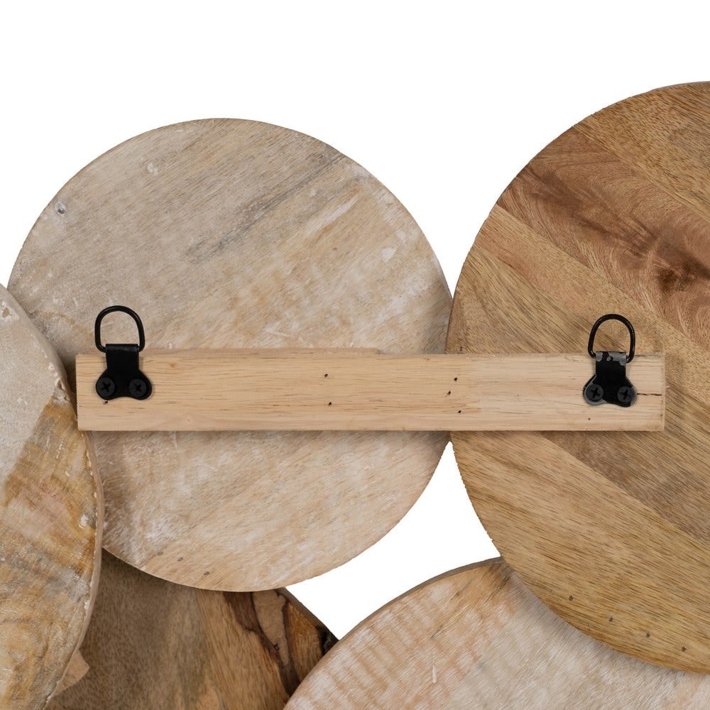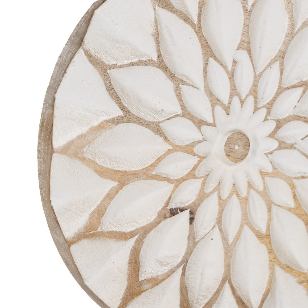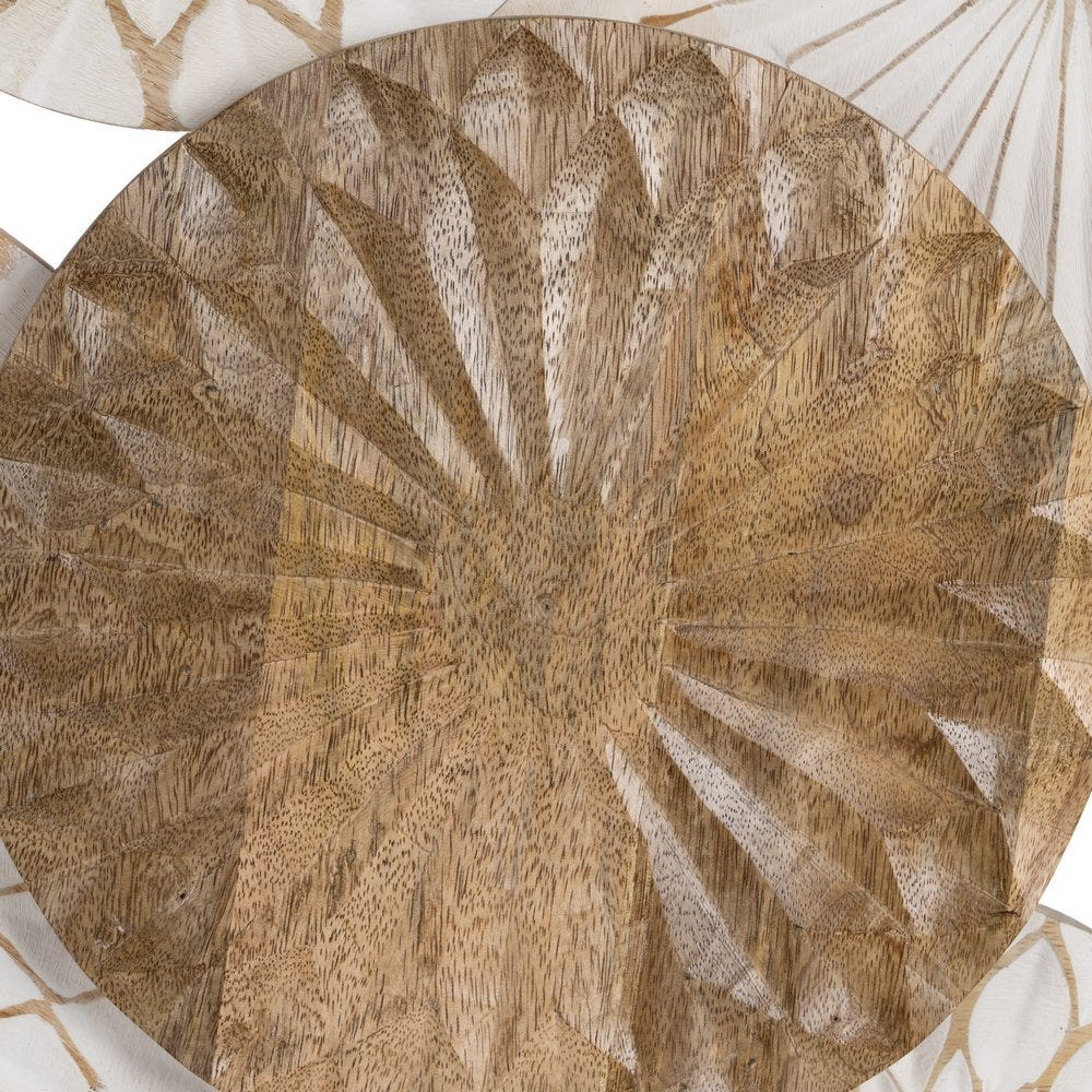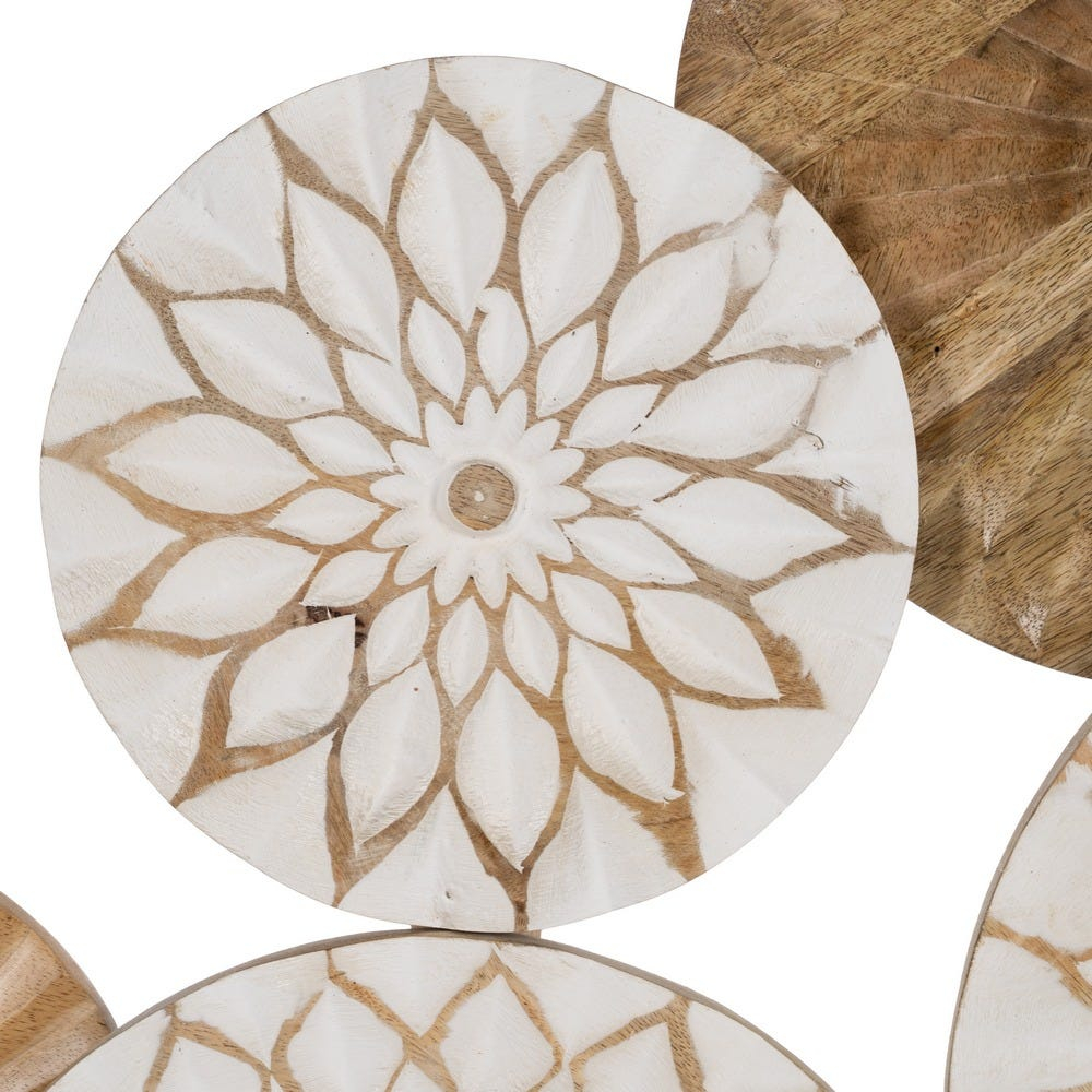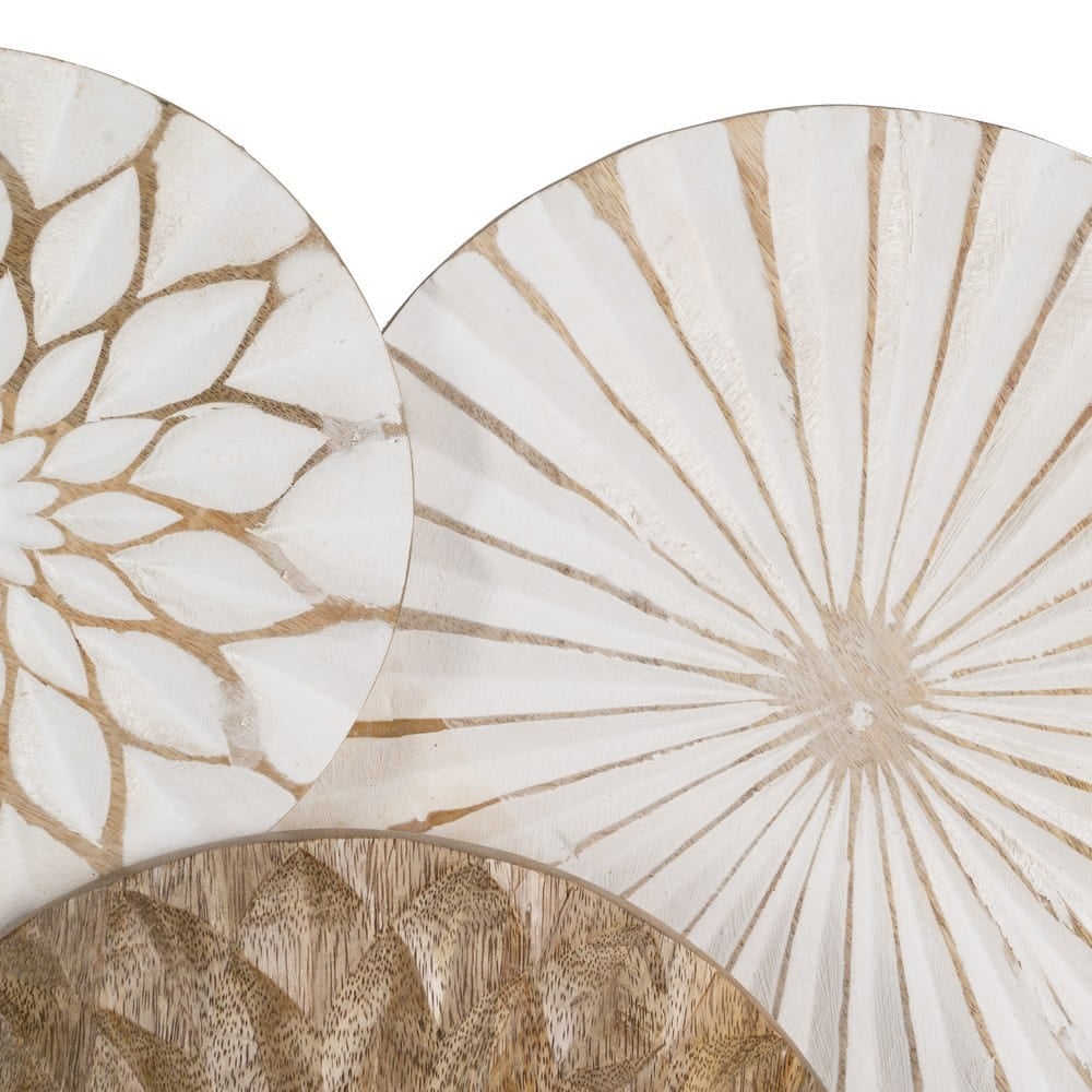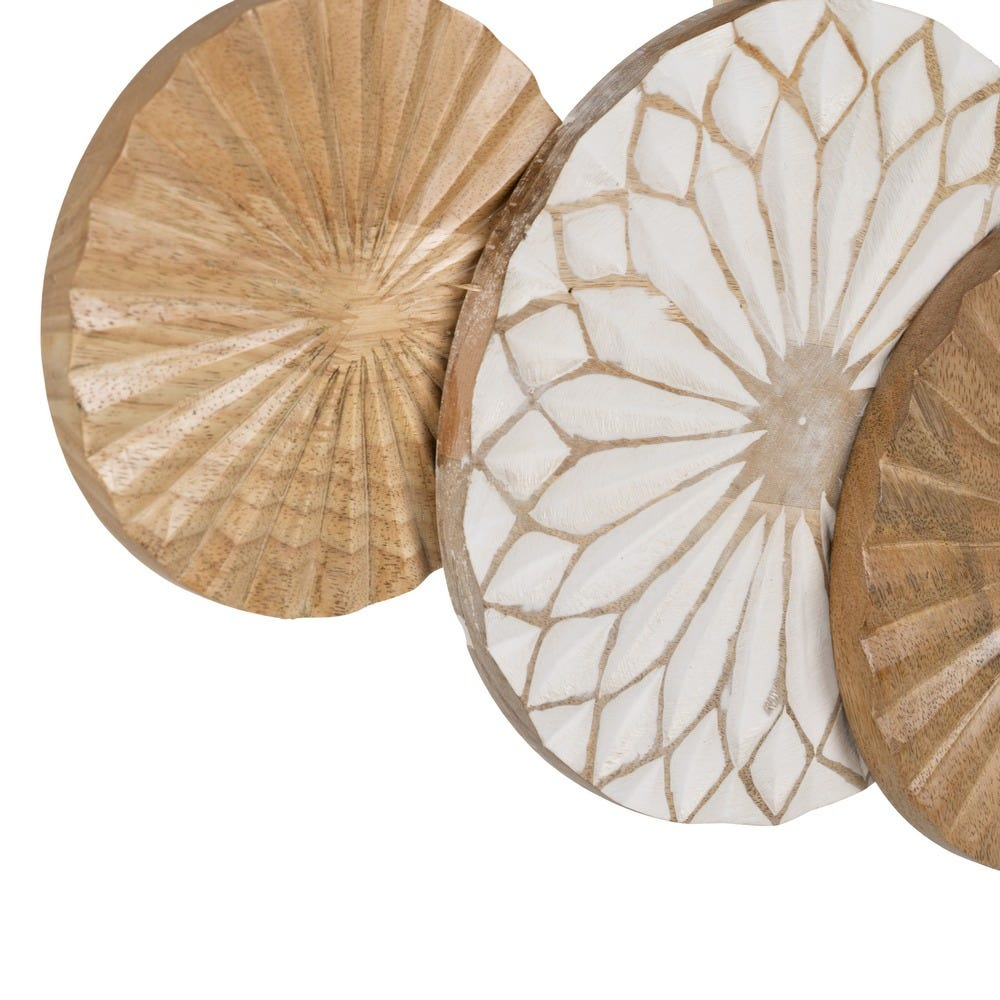 Un element decorativ spectaculos care combină texturi naturale și forme circulare inspirate de motive florale. Realizată din lemn de mango, această piesă de perete aduce căldură și profunzime oricărui decor, prin tonurile sale blânde de alb și bej natural.