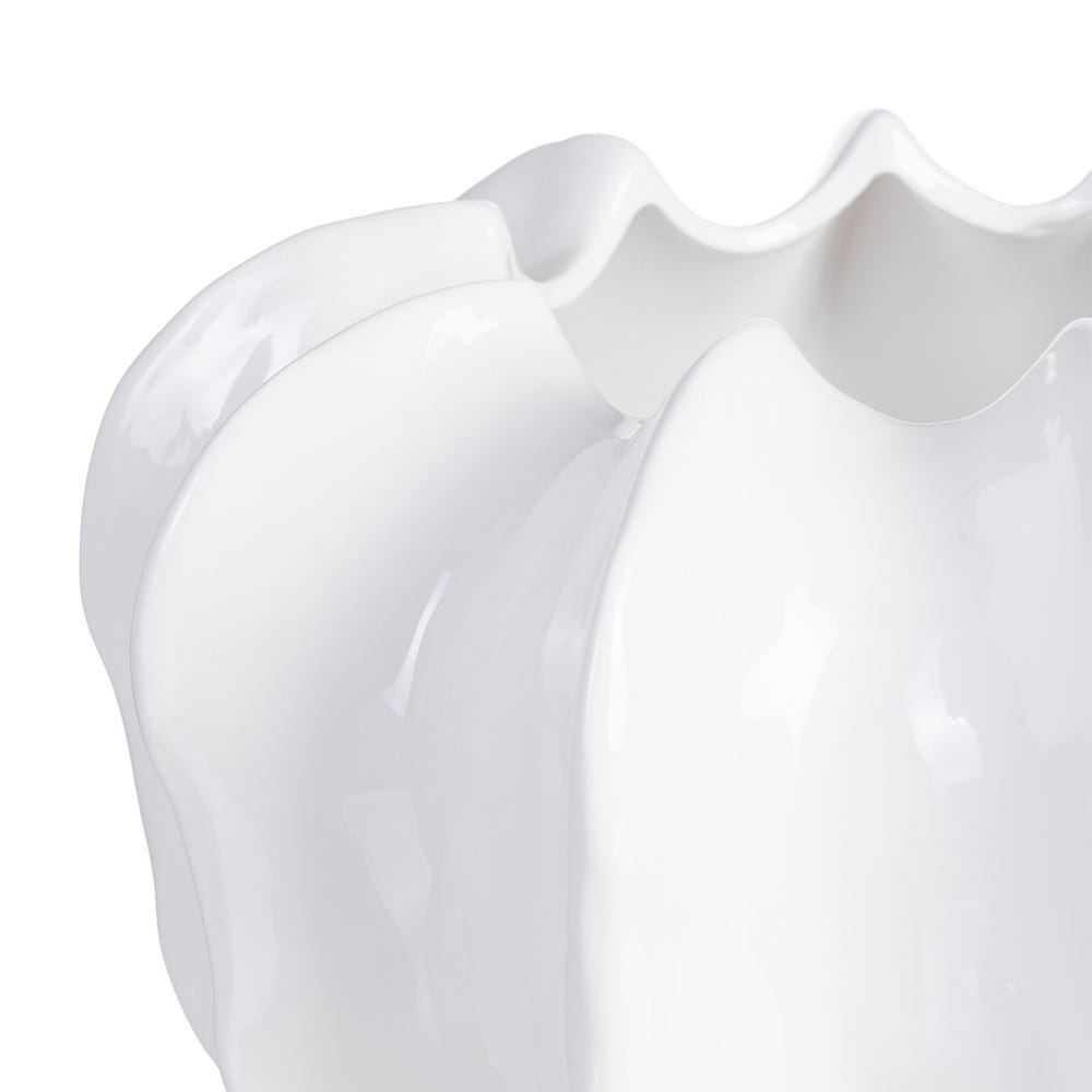 Ghiveci din ceramică albă lucioasă cu formă sculpturală, ideal pentru decor contemporan în living, dining sau hol. Silueta ondulată creează reflexii elegante și pune în valoare plantele de interior, transformându-le într-un accent decorativ modern.