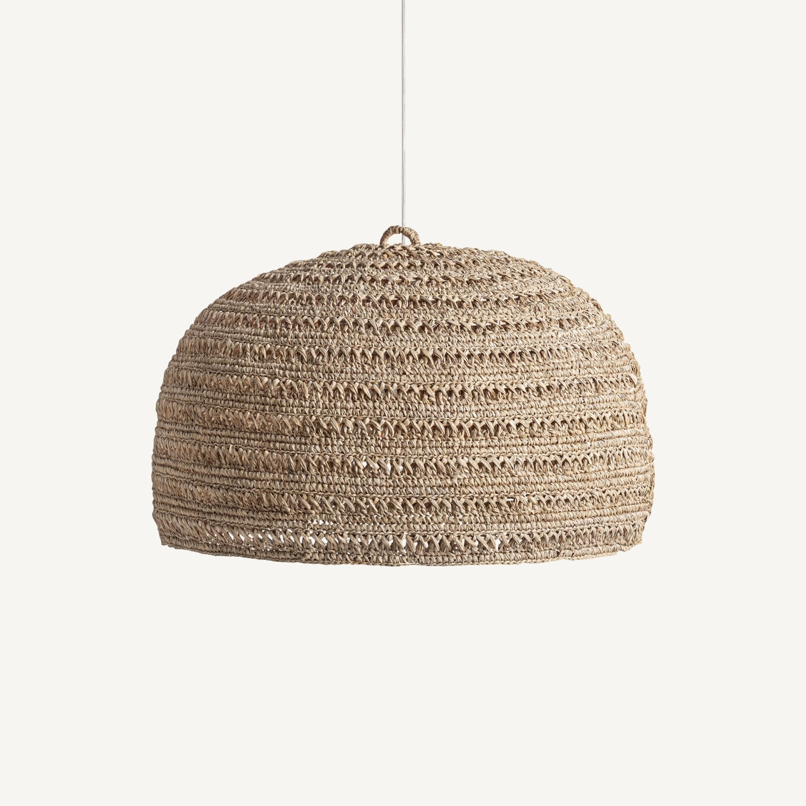 Abajurul semicircular este lucrat din fibre naturale, împletite atent, care îi dau structură și o fibră vizibilă ce difuzează lumina într-un mod blând. Marginile ușor neregulate și finisajul natural aduc un caracter rustic-actual, iar densitatea împletiturii echilibrează permeabilitatea luminii — suficientă pentru a crea atmosferă, dar fără a produce orbire.