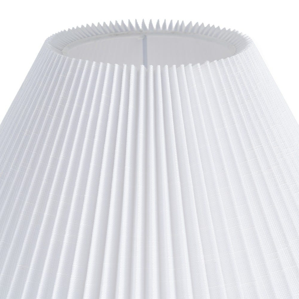 Abajurul alb plisat din PVC filtrează lumina într-un mod delicat, creând o lumină difuză și relaxantă. Lemnul maro aduce căldură, iar detaliile aurii completează designul cu un accent discret, dar elegant.